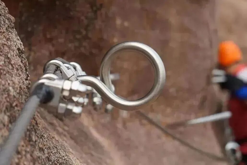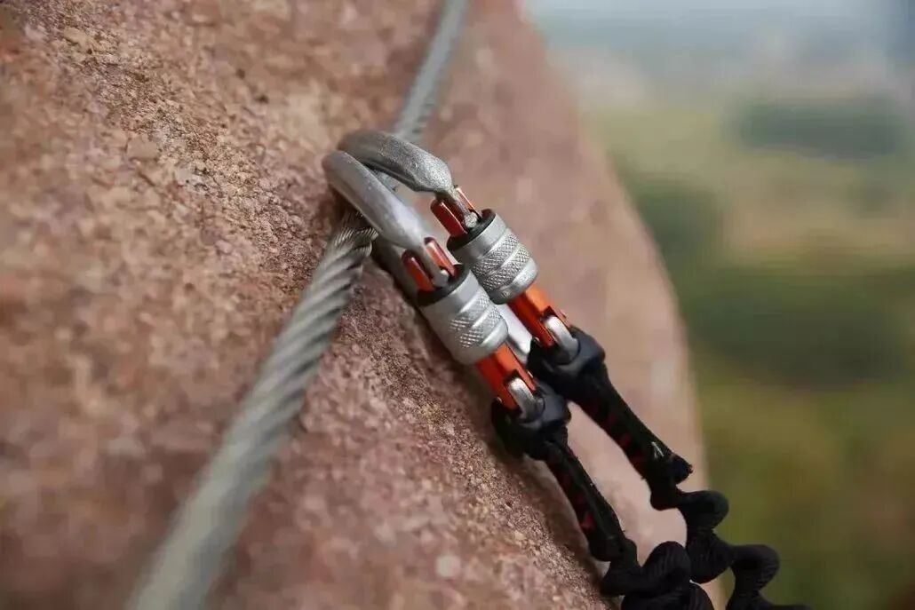 飞拉达的部件主要有金属扶手、梯级、缆索、脚蹬等,每一位体验者都会系上安全绳,确保安全万无一失。
