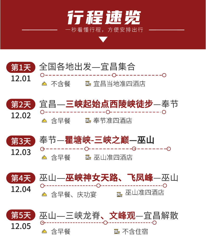 2、住宿:1晚宜昌市区准四酒店,1晚奉节准四酒店,2晚巫山准4酒店;