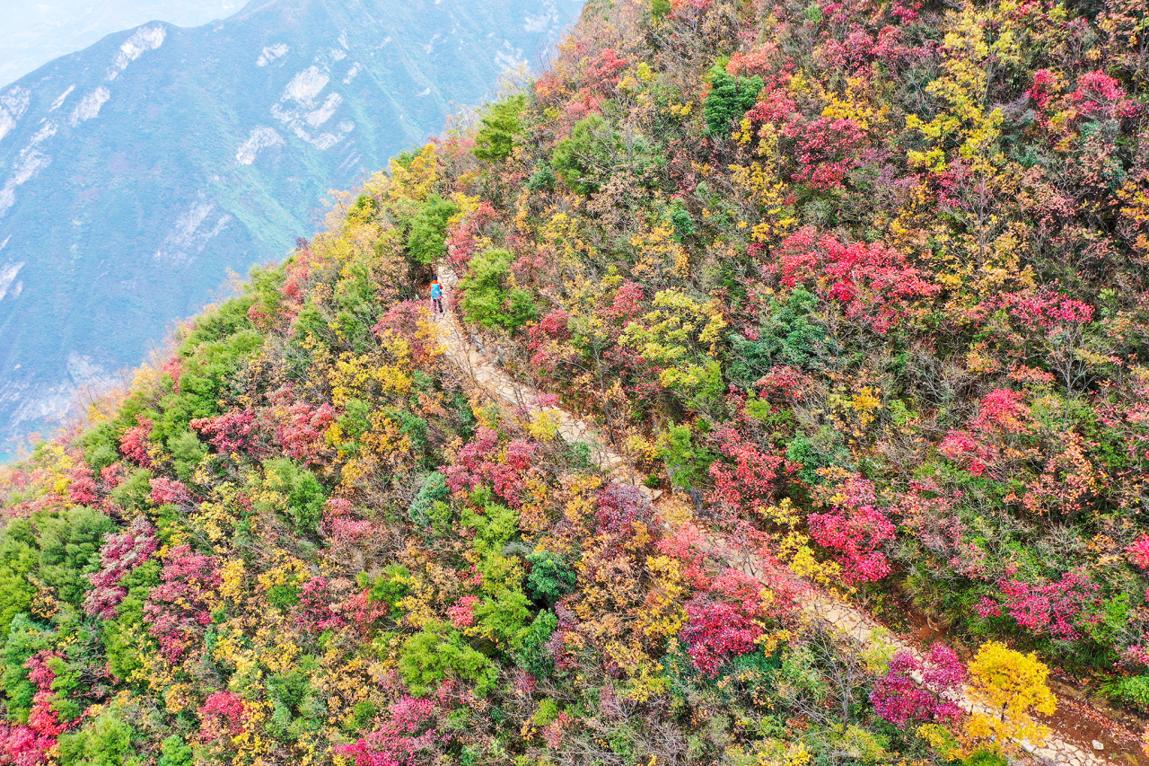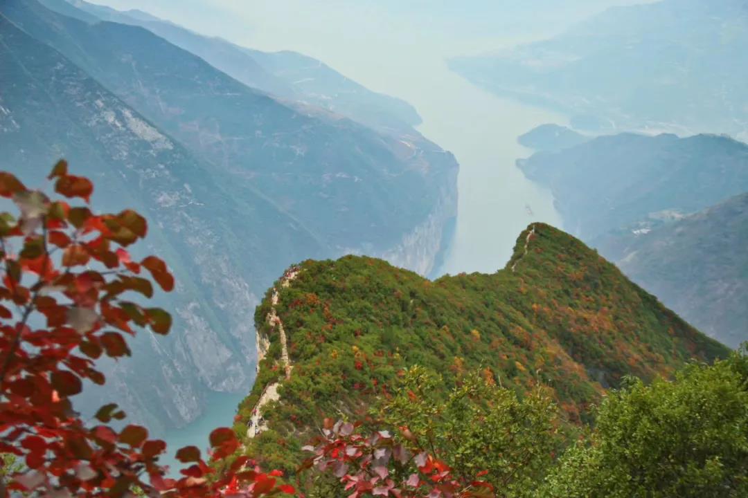 文峰观多走一段路。约2-3公里。有一段最美的三 峡龙脊路线。一面是壮观的长江三峡红叶。一面是绿树葱葱。也是摄影爱好者最佳拍摄位置。(本次徒步三峡龙脊精华段)