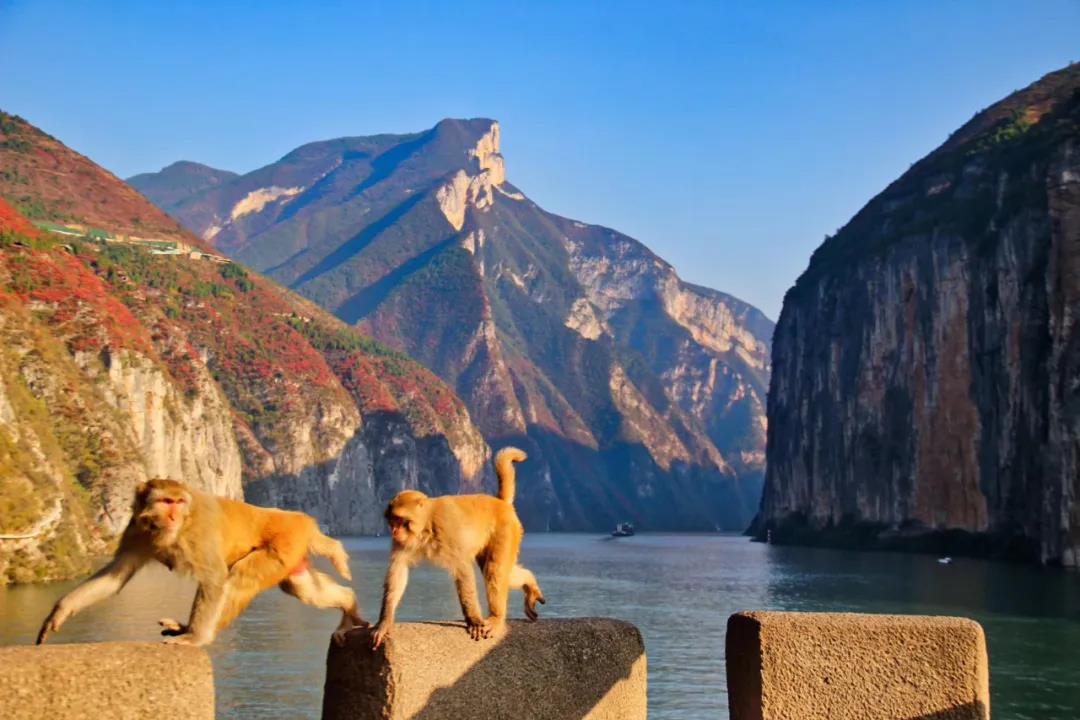 在前往江边白帝城后山沿途会碰到很多野猴子,在瑰丽山水间前行,两岸传来野猴的叫声,终于体会到李白当年在此写下“两岸猿声啼不住”的真实感。