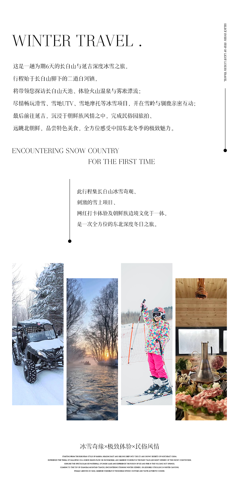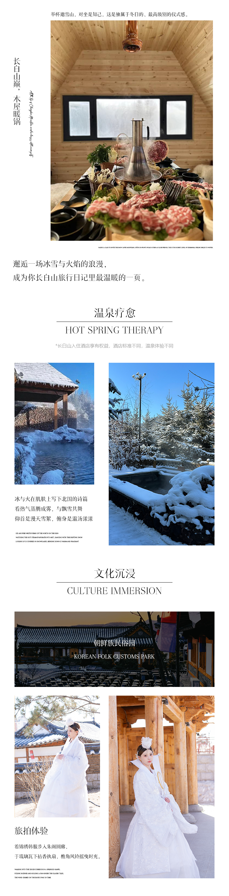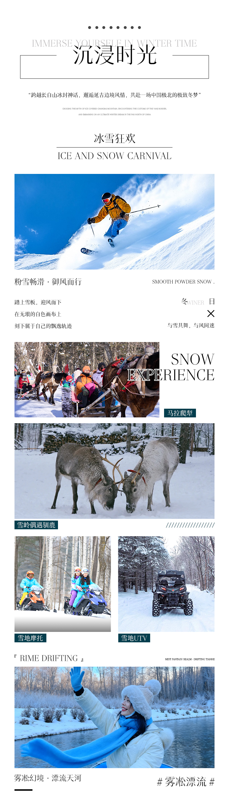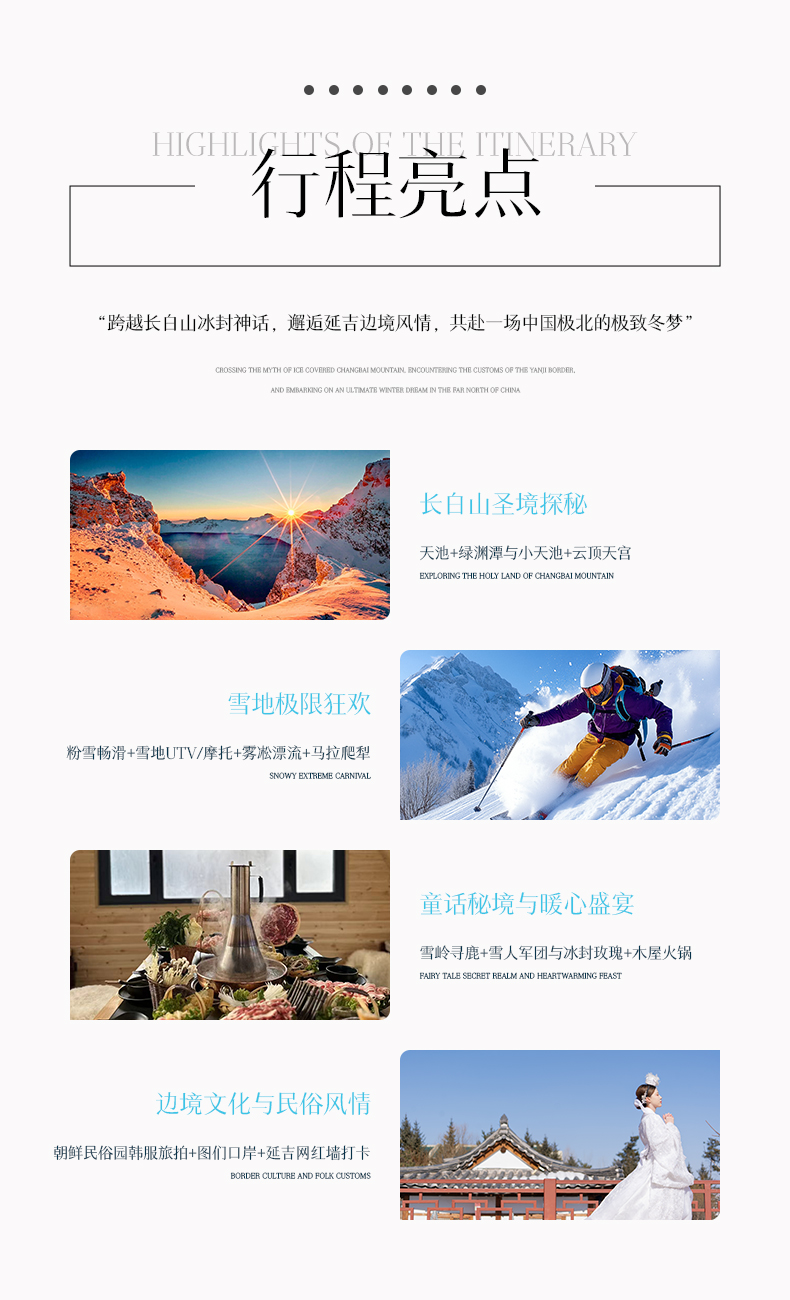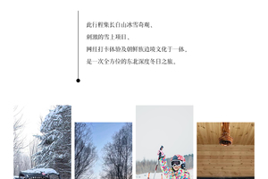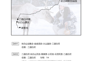 体验 项目 | 长白山和平/红松王滑雪场粉雪畅滑初级雪道门票(雪鞋+雪版+雪仗使用),极寒雾凇漂流(防水大衣每人一件),喂驯鹿,马拉爬犁,雪地摩托,雪地UTV 7公里(有驾驶证可以自己驾驶,没有驾驶证需要教练驾驶陪同),朝鲜民俗园旅拍(3张电子精修+1套服装+韩式妆造+15张电子底片赠送) | |