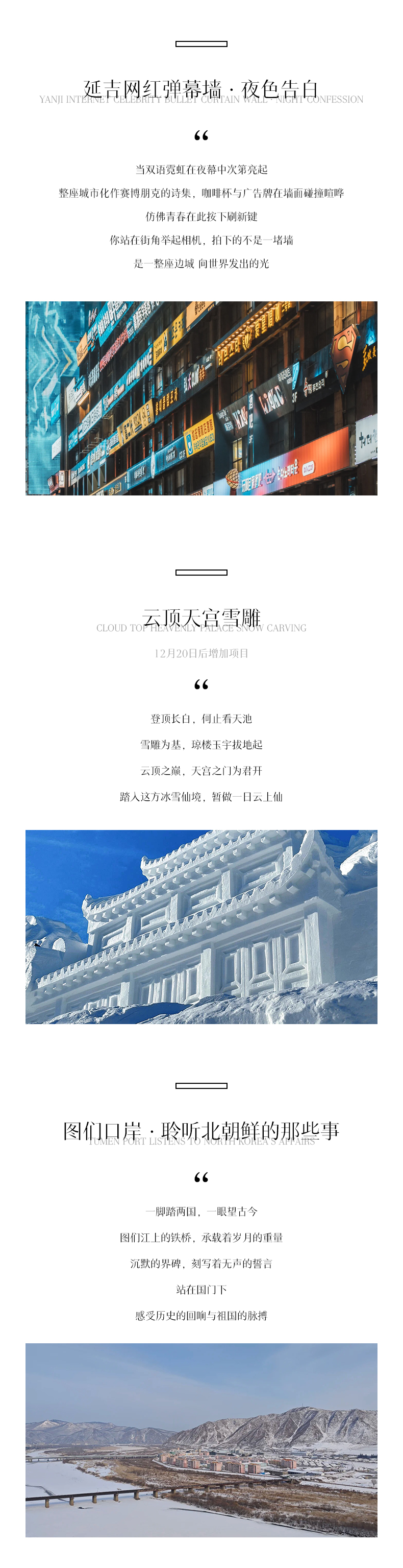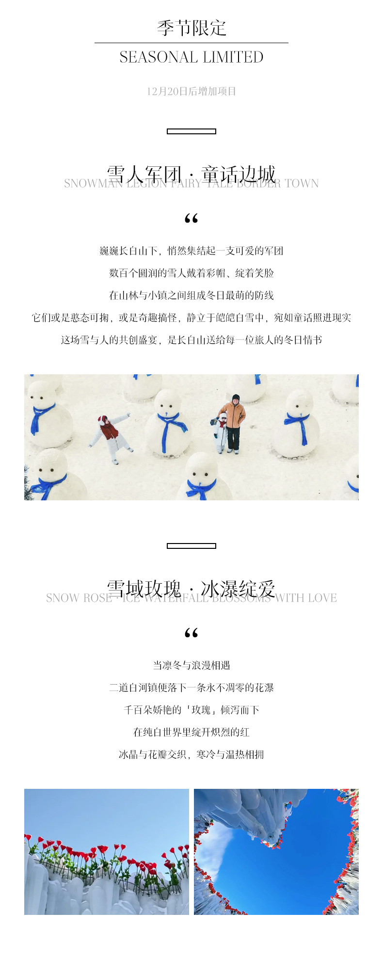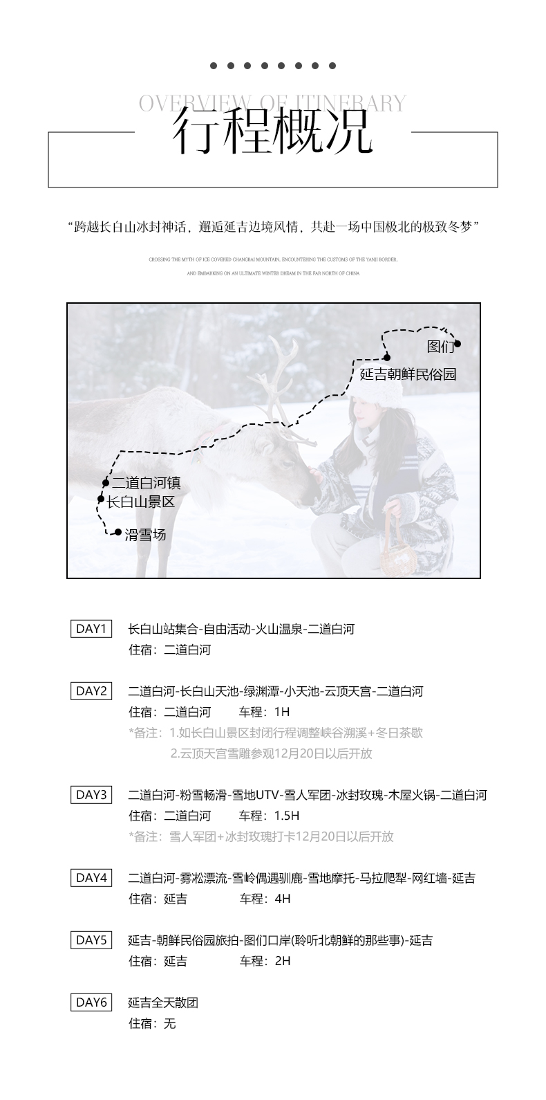 赠送 项目 | 1.50万旅游意外险; 2.接送机服务说明: D1:长白山站接站(不指定车型) D6:延吉送机/高铁站送站,接送机不指定车型 3.云顶天宫(二道白河镇政府公益免费项目,具体开放以当地政府为准); 4.雪人军团+冰封玫瑰打卡(为雪绒花景区免费开放项目,12月20日以后开放)。 | |
