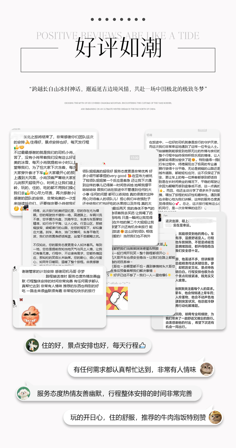 〖集散地点〗:长白山站集合/延吉解散 〖出行攻略〗:团期日即为全天集合日,无任何集体活动,因此建议您选择团期日的航班班次即可,集合日当天手机保持畅通,接机师傅会联系您,请勿着急,接机人员于您飞机落地时联系您; 〖特殊说明〗:由于此产品游览区域隶属东北,经济发展缓慢,物资匮乏,旅游资源条件有限,无法与一二三线城市旅游资源比较,如遇相关问题敬请见谅! | ||