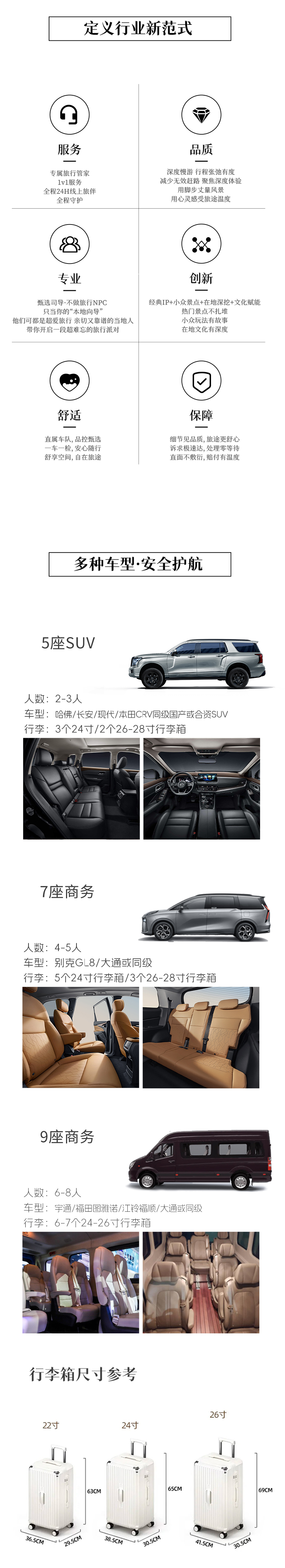 用车 | 根据出行人数选择相对应车型,每人限携带一个24寸以内行李箱,如有行李不符问题请提前咨询 | |