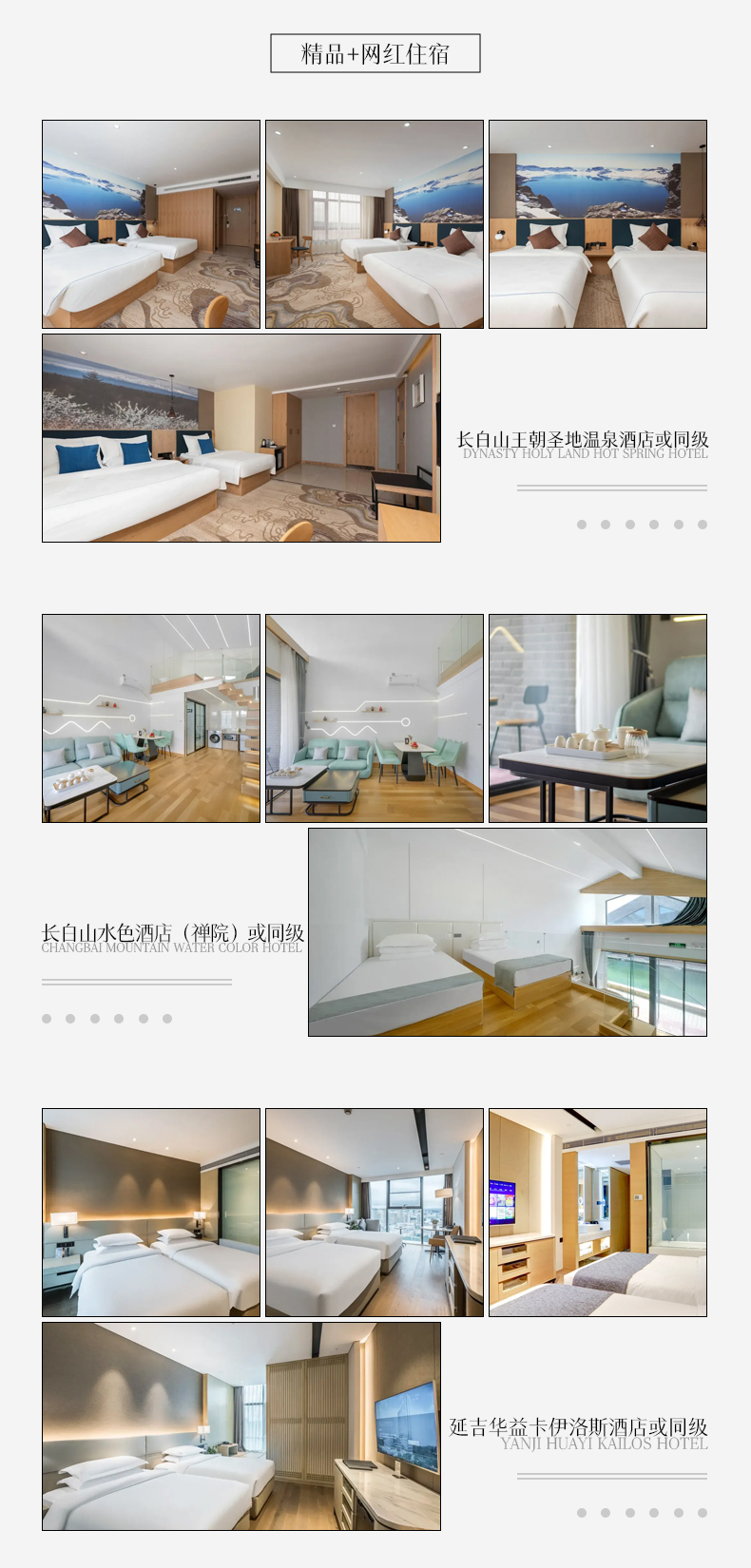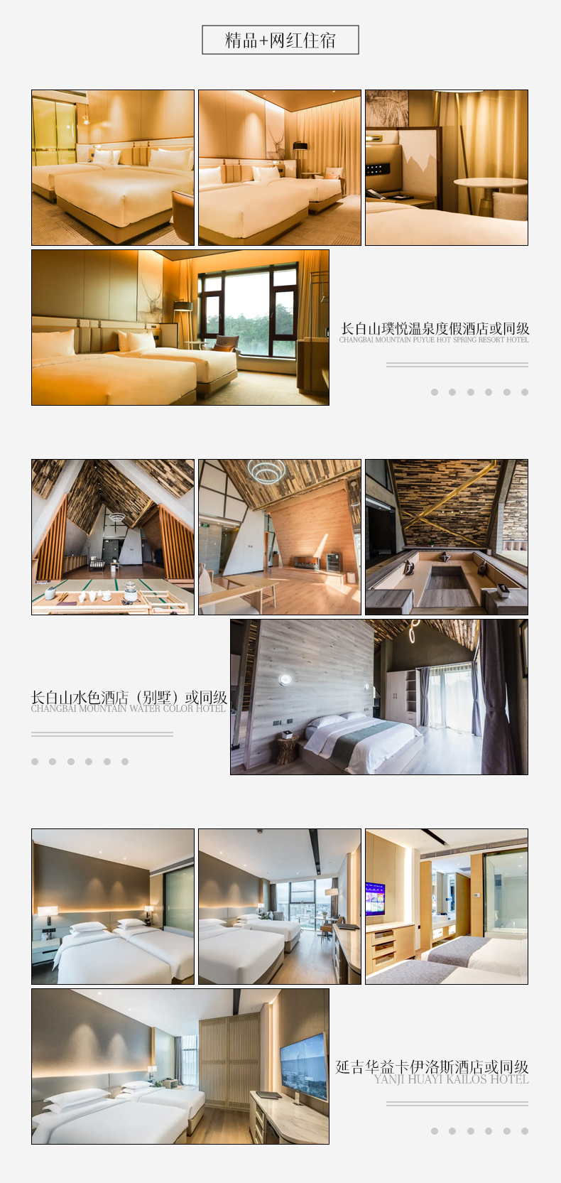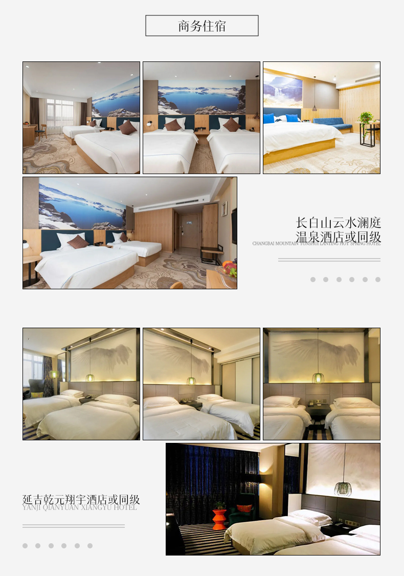 第一晚:王朝圣地温泉酒店或同级 第二晚:水色禅院/觅谷别苑或同级 第三晚:水色禅院/觅谷别苑或同级 第四晚:延吉卡伊洛斯酒店/红菊大酒店或同级 第五晚:延吉卡伊洛斯酒店/红菊大酒店或同级 | ||