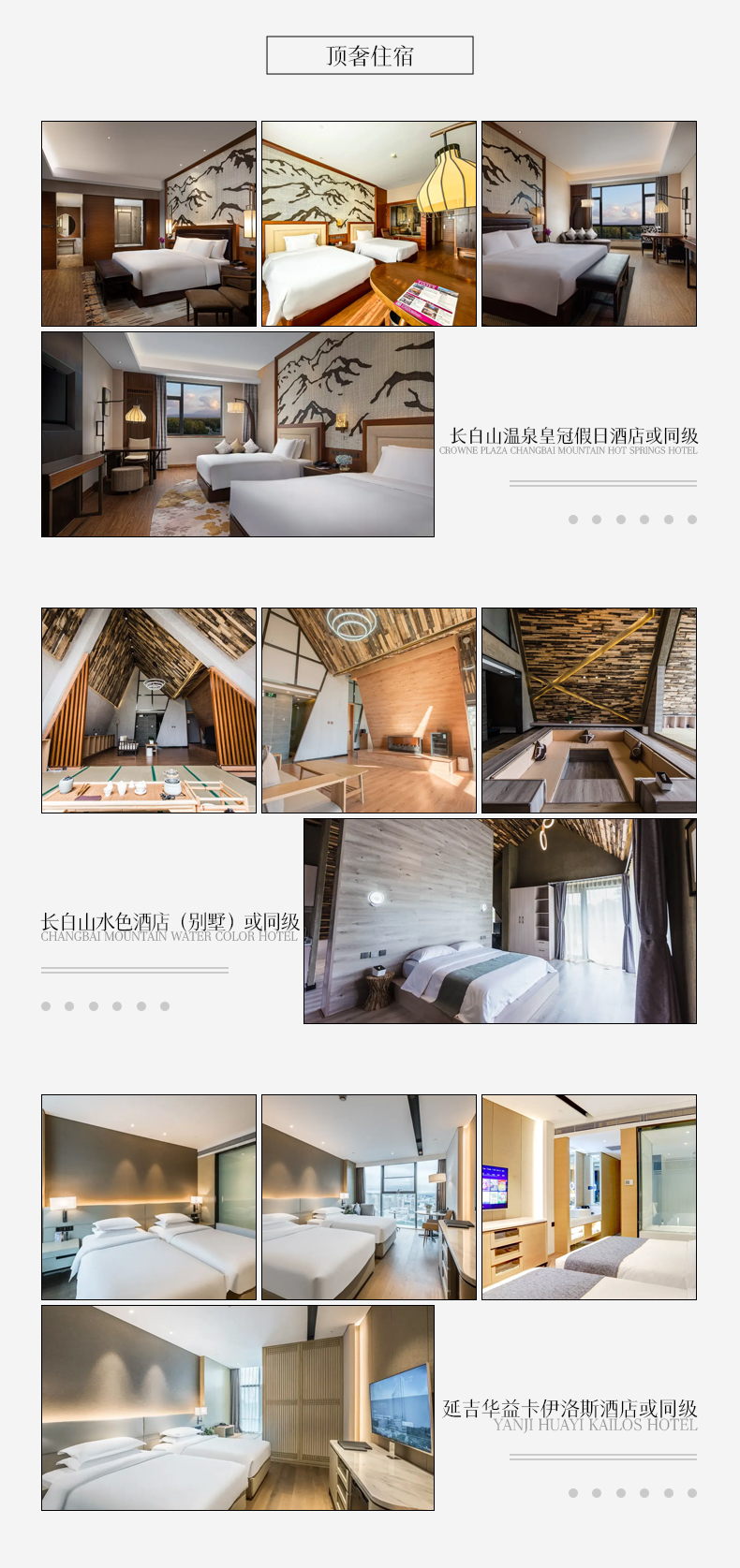 第一晚:长白山温泉皇冠假日酒店或同级 第二晚:长白山温泉皇冠假日酒店或同级 第三晚:水色别墅 第四晚:延吉卡伊洛斯酒店/红菊大酒店或同级 第五晚:延吉卡伊洛斯酒店/红菊大酒店或同级 | ||