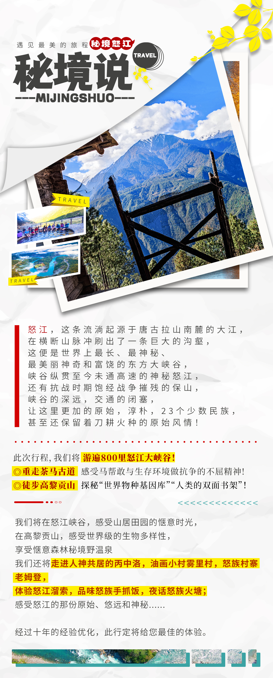 1、独龙江位于祖国边境,山高路远,若因不可抗力(堵车、道路塌方等)或政策因素无法进入,领队将会对行程做适当调整,保证行程的顺利进行;
