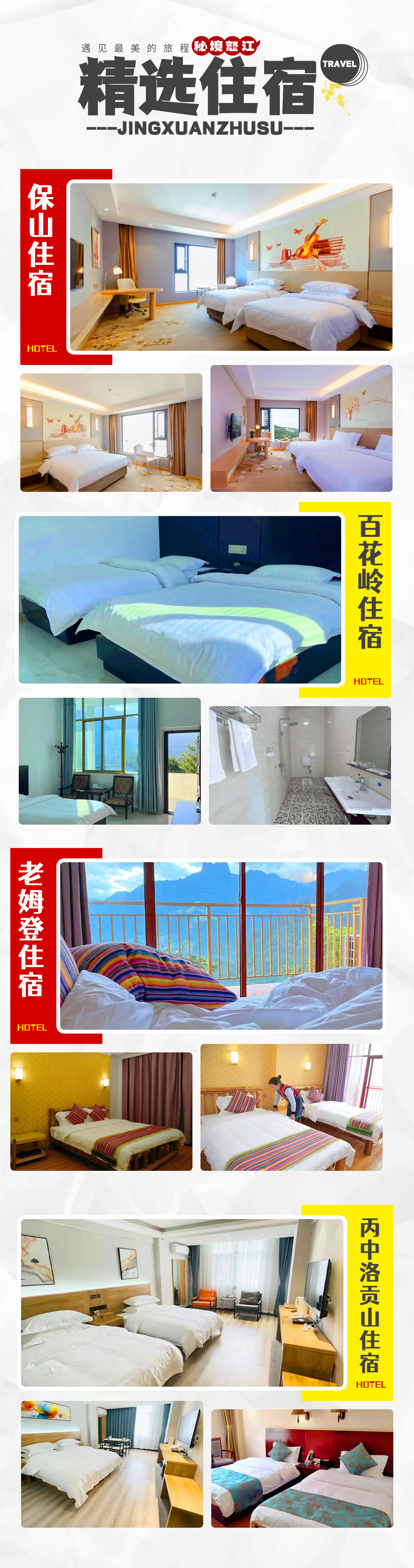 2、全程住宿费6晚(保山四星钻酒店1晚,百花岭民宿1晚,老姆登精选酒店1晚,丙中洛/贡山精选酒店3晚);