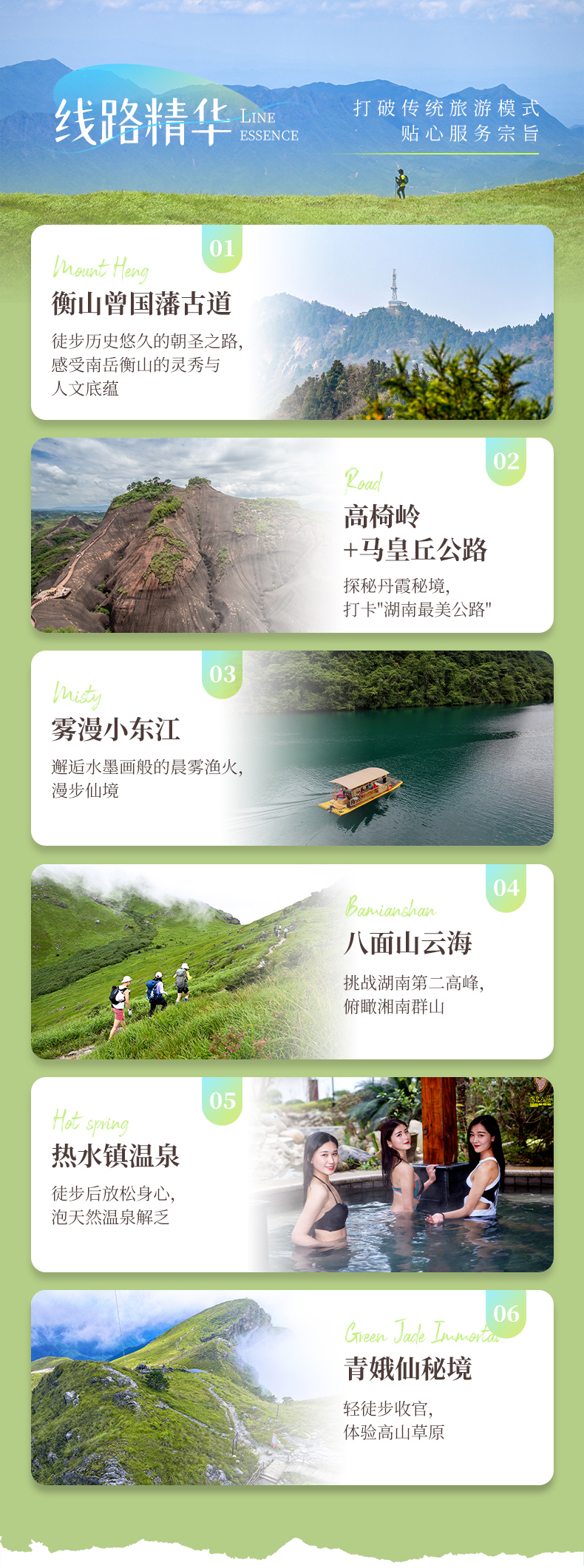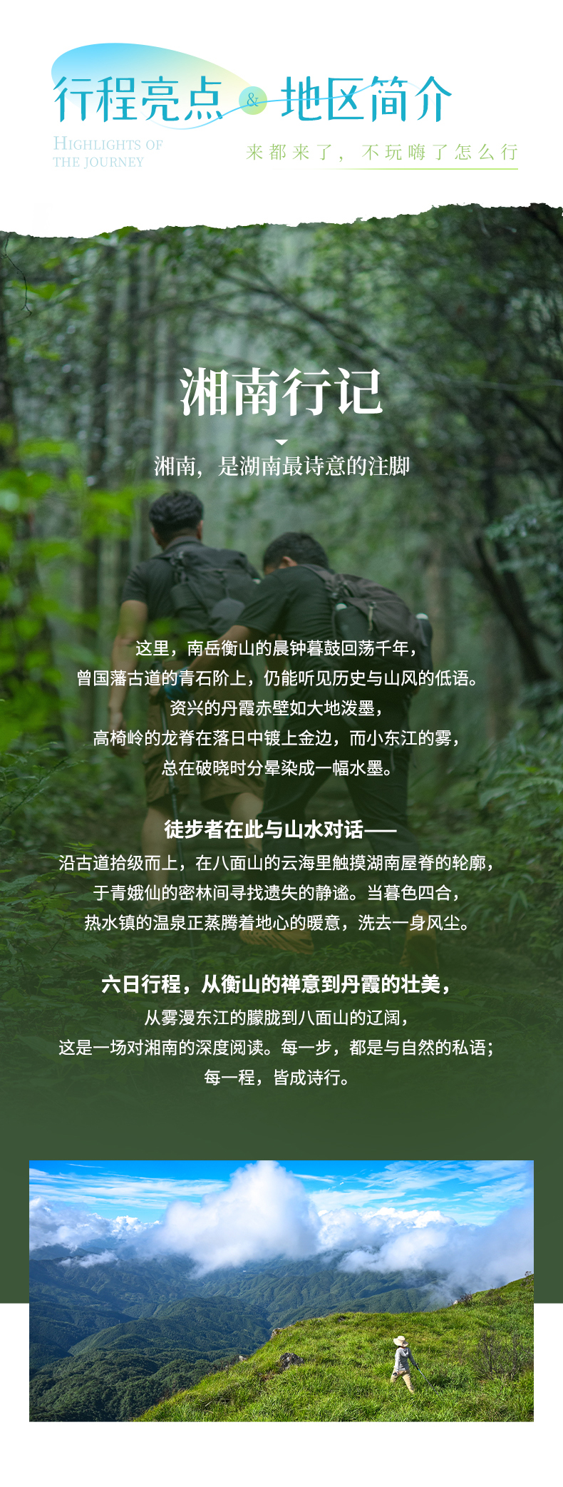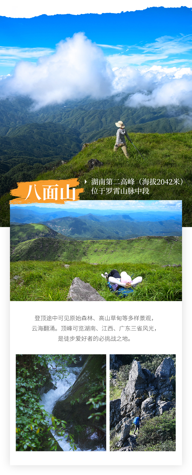 酒店早餐后出发(车程2小时至登山口)八面山徒步挑战(往返约9公里)我们将拾阶而上,沿路溪流,瀑布,森林,高山草原感受海拔上升不同的植被变化。顶峰可360°观三省风光,云海季更壮观(如遇八面山森林防火期不对外开放,我们将根据情况改走齐云山,风景和徒步强度同八面山一样)徒步结束后集合前往桂东县城(车程2小时)。