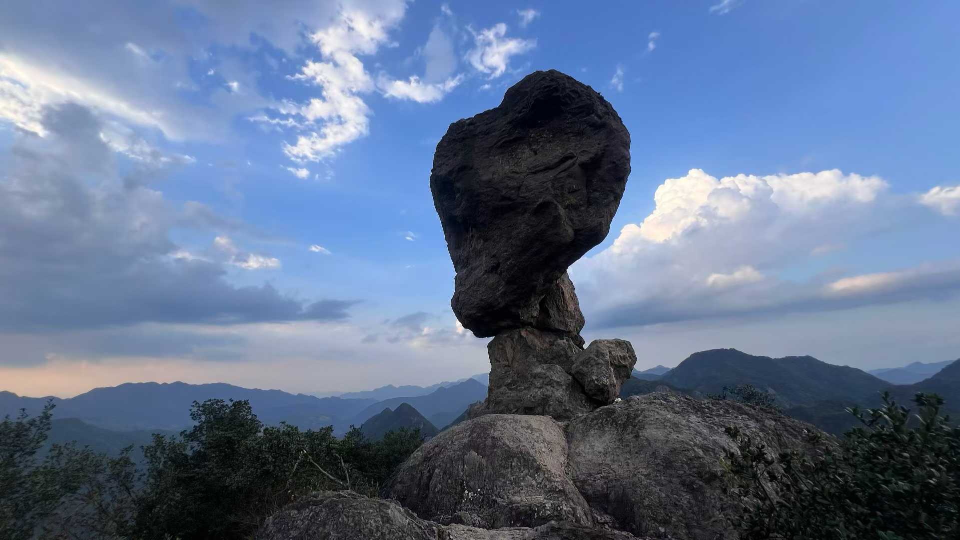 14:30前后到达美女峰。美女峰形状怪异,初看如蘑菇云冉冉升天,复审视,犹如一尊仙女肖像,面向南天,立于云表。正侧向背成型,又称香炉石、颠倒壶瓶、三接石、接石顶、一拳冲天。美女帅锅们大摆pose.周边视野开阔,风光秀丽。接着从另一边下山!