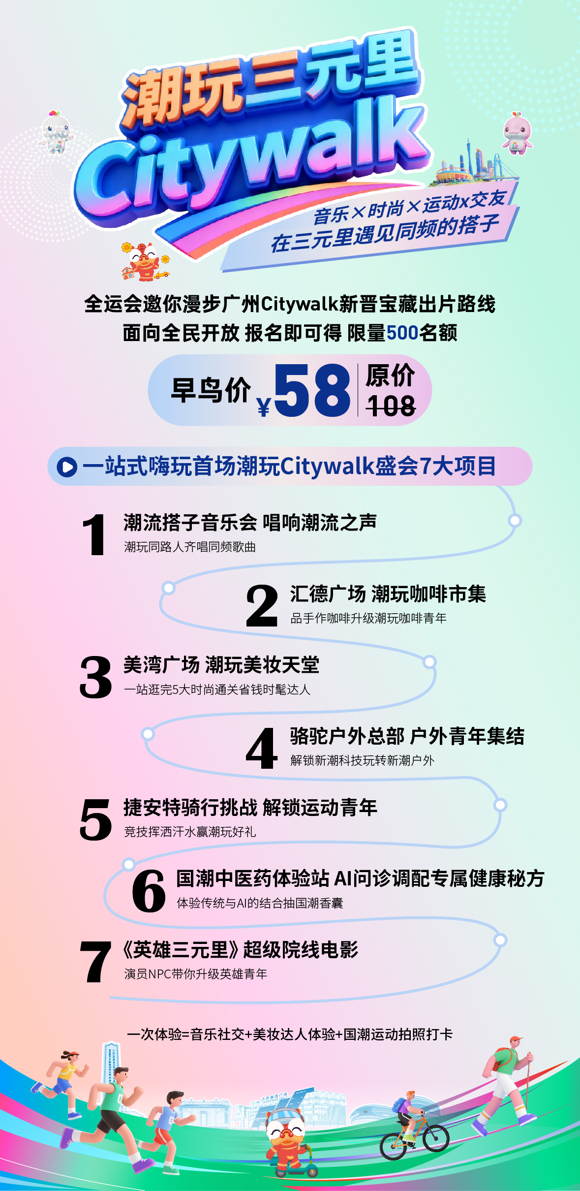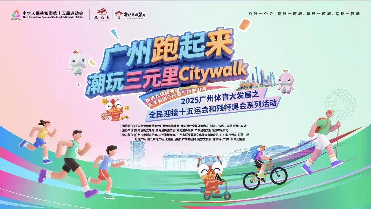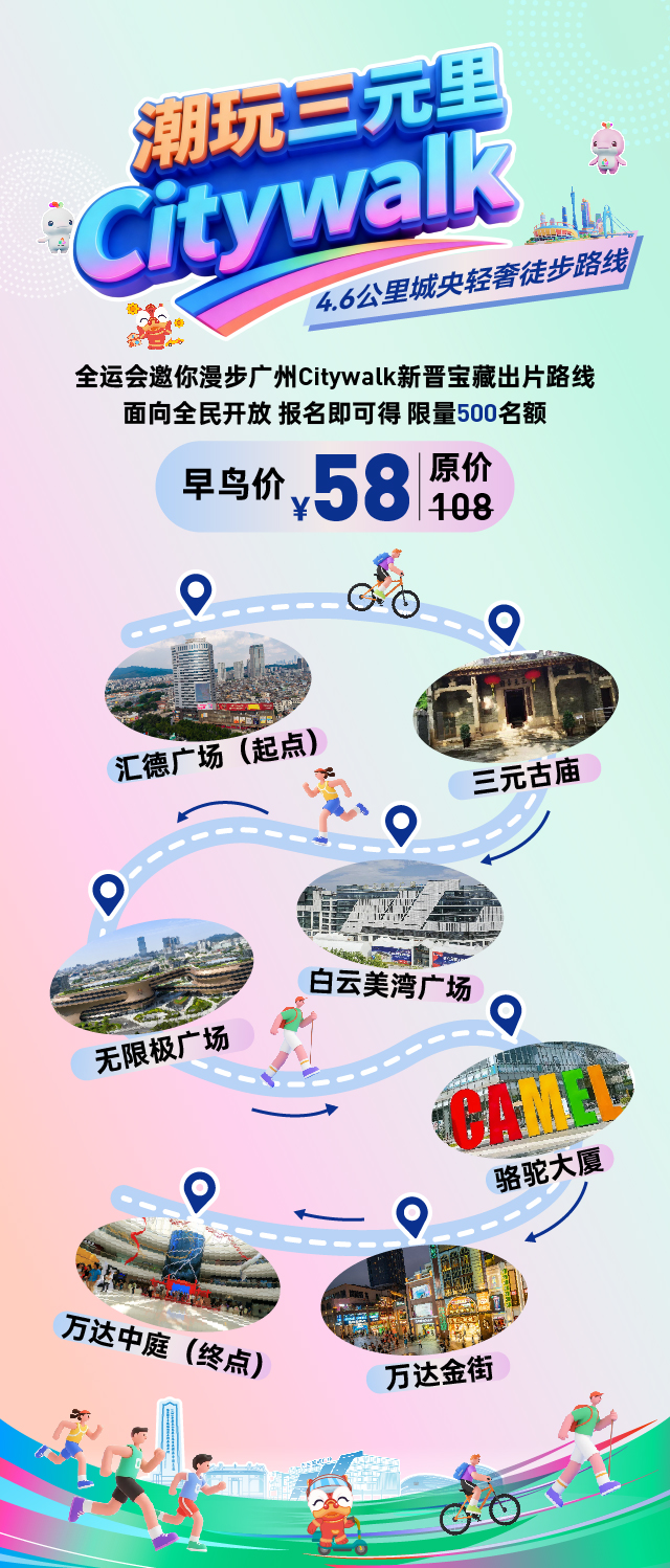 骆驼户外总部轻奢户外+捷安特潮流骑行+潮玩音乐会+咖啡搭子市集+美湾广场时尚美妆+国潮中医药+《英雄三元里》电影NPC与电影周边+全运会帆布包...2小时4.6公里城央徒步一站式漫步奢享!