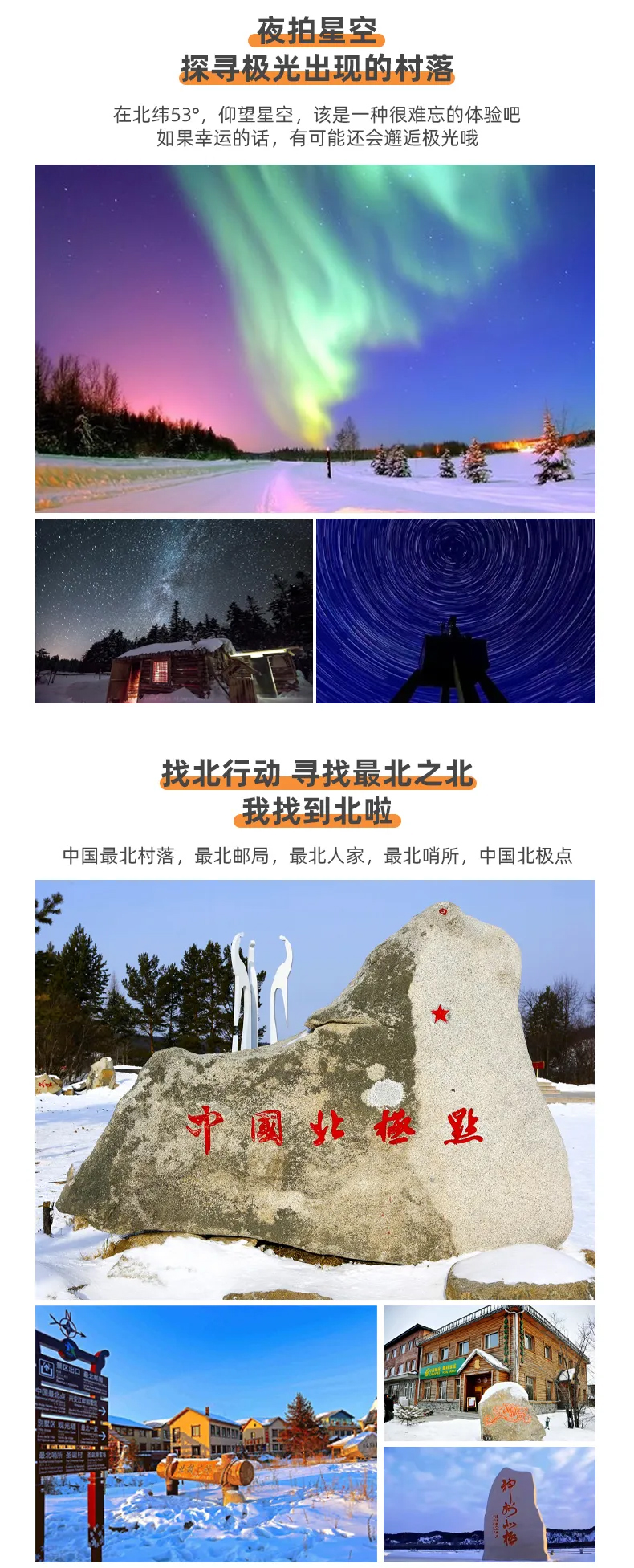 5.全程门票费:雪乡门票、大雪谷穿越、北极村门票、圣诞村门票、龙江第一湾+乌苏里浅滩门票、驯鹿苑门票