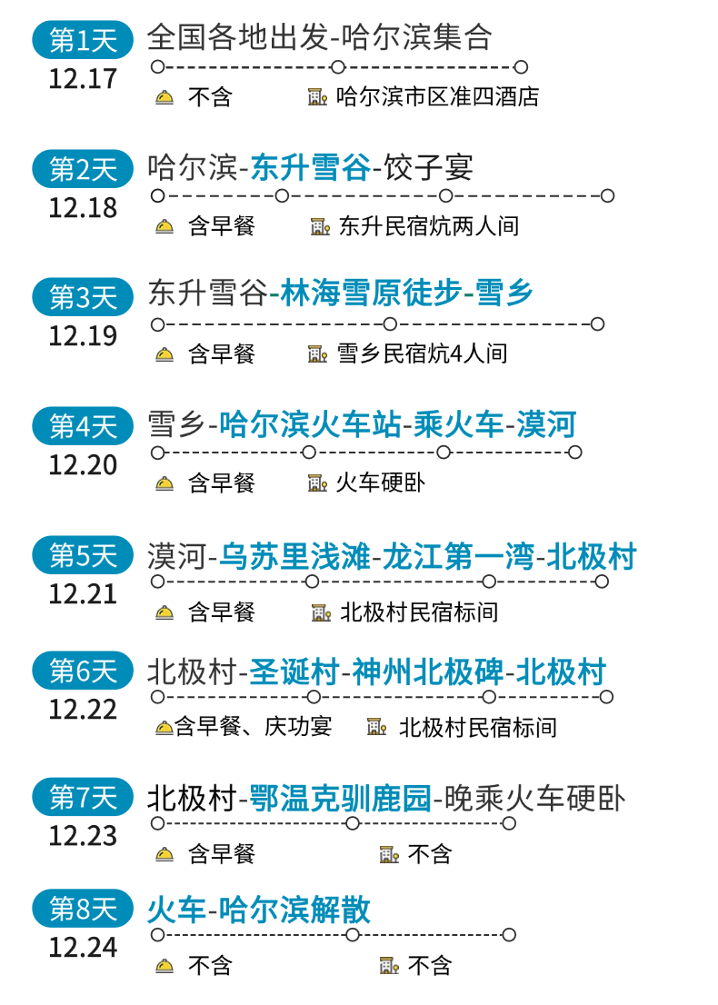 3.全程包含5早餐:哈尔滨早餐、雪谷早餐、雪乡早餐、北红村早餐、北极村早餐,(有两个早餐火车上自理)以及一个跨年庆功宴