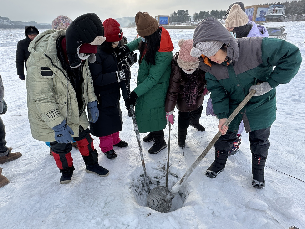 11:30 我们前往河边冬捕,来到村旁的河面上,鱼把头穿着大皮袄,在用力地【拉网】活蹦乱跳的鱼跃出水面,这一幅画面生机勃勃,又是北国给予的另一番别致体验。