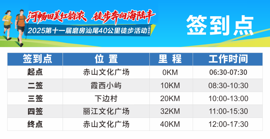 本届汕尾40公里徒步活动设置5个固定签到点,需凭签到卡签到补给和领取纪念牌。