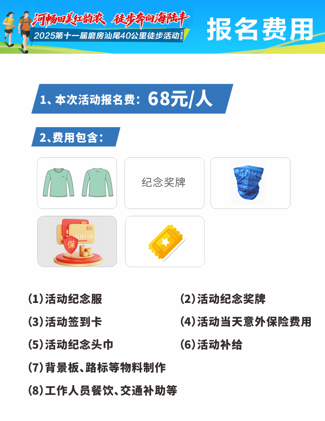 本活动有一定的风险,为保障参加者的利益及汕尾40公里的顺利开展,本次活动由组委会统一购买活动当天有效的意外伤害保险(仅限报名参加人员)。