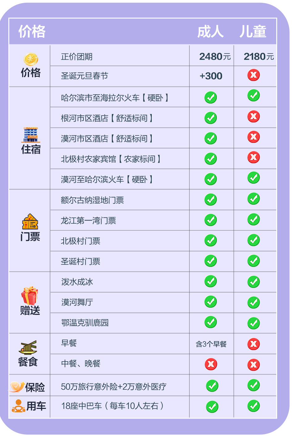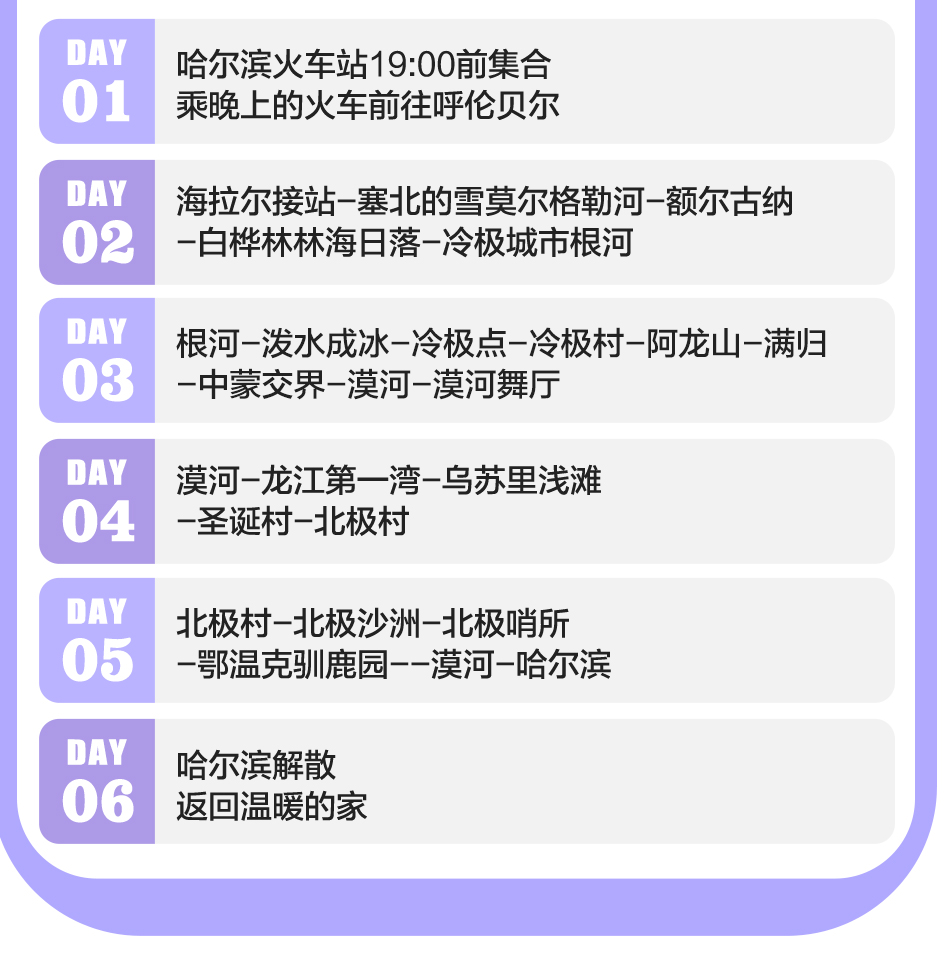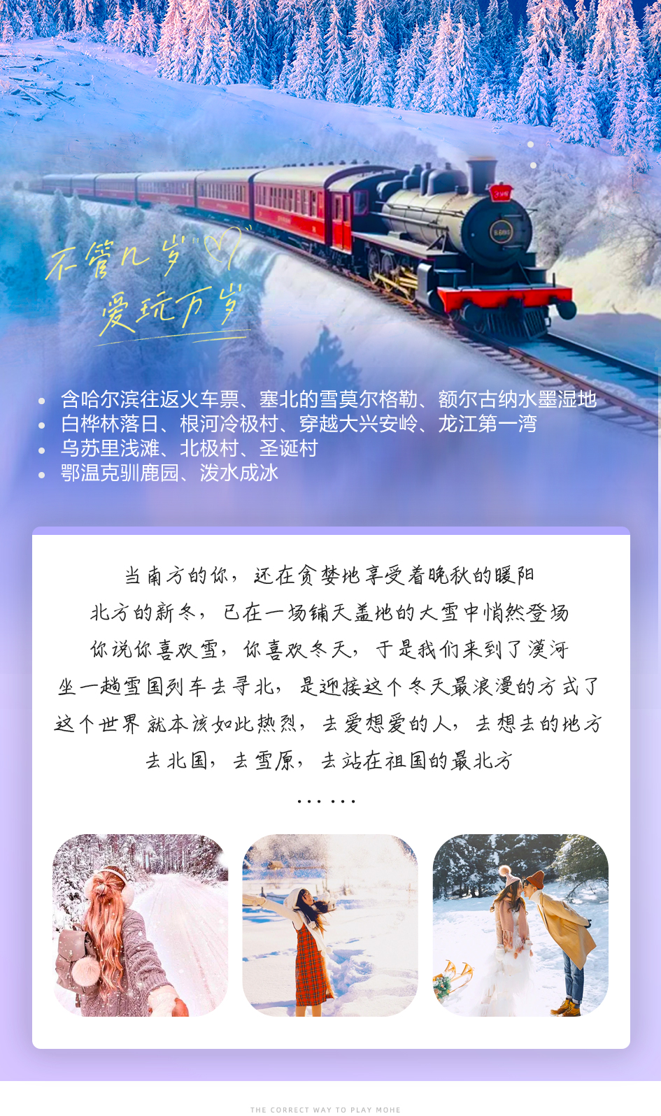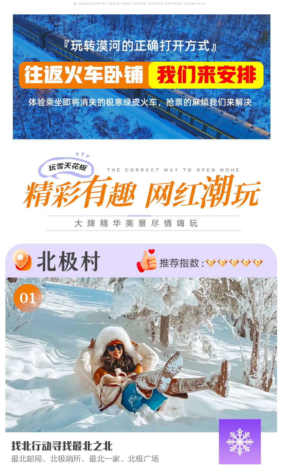 2、火车:哈尔滨-漠河往返火车硬卧(铺位随机,一起报名的小伙伴尽量安排同一节车厢,但冬季票务紧张无法保证,建议提前15天以上预定,15天以内报名请现询是否有票)