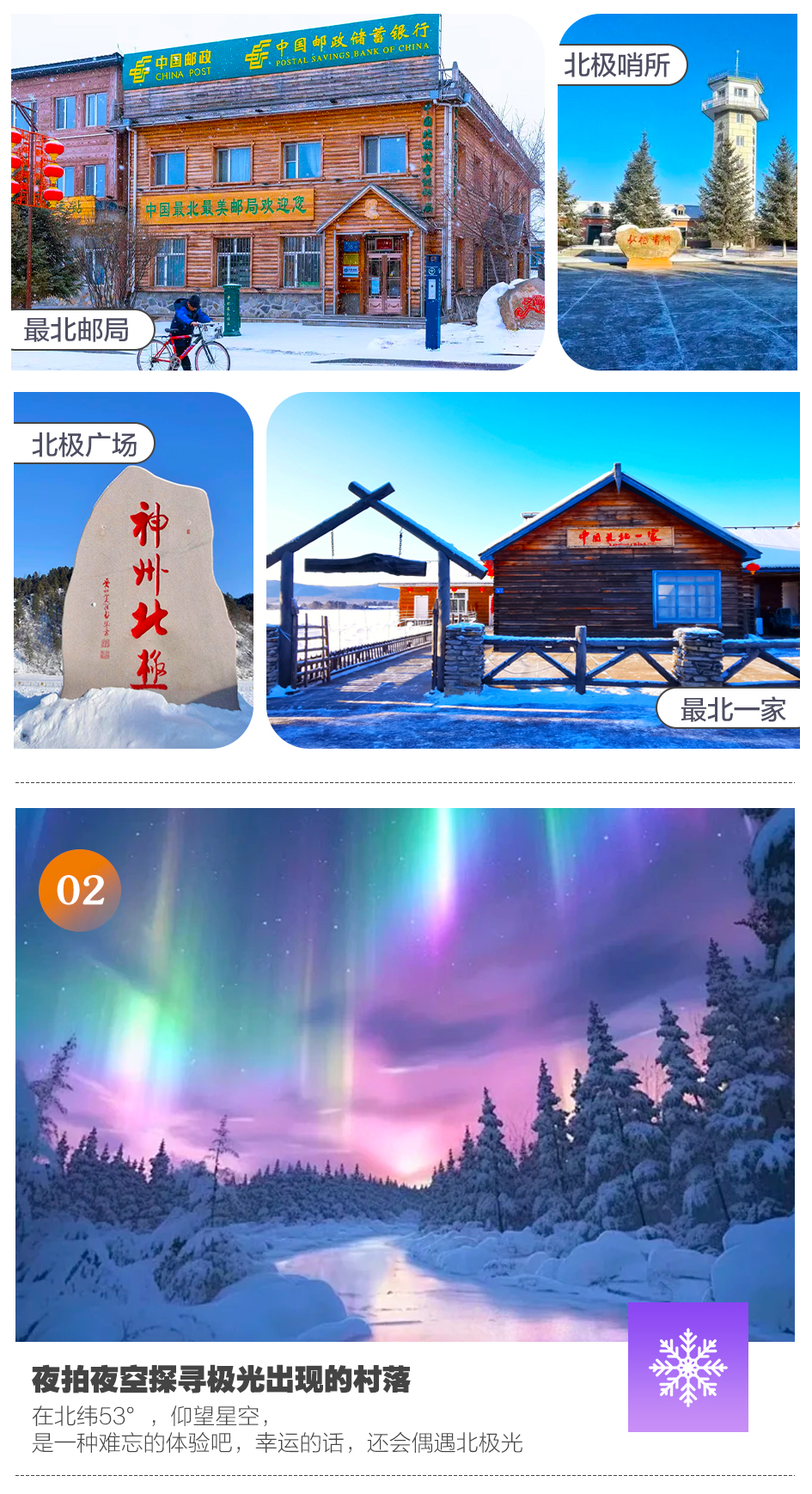 抵达北极村,跨越了半个中国来见你,这里有中国“北方第一哨”北极哨所,这里是中国唯一观测北极光的最佳地点,北极村另一大乐趣就是“极北”的探索,这里的一切都要冠上“最北”二字。最北哨所、最北邮局、最北餐厅……让你忍不住想把所有的最北都找到。