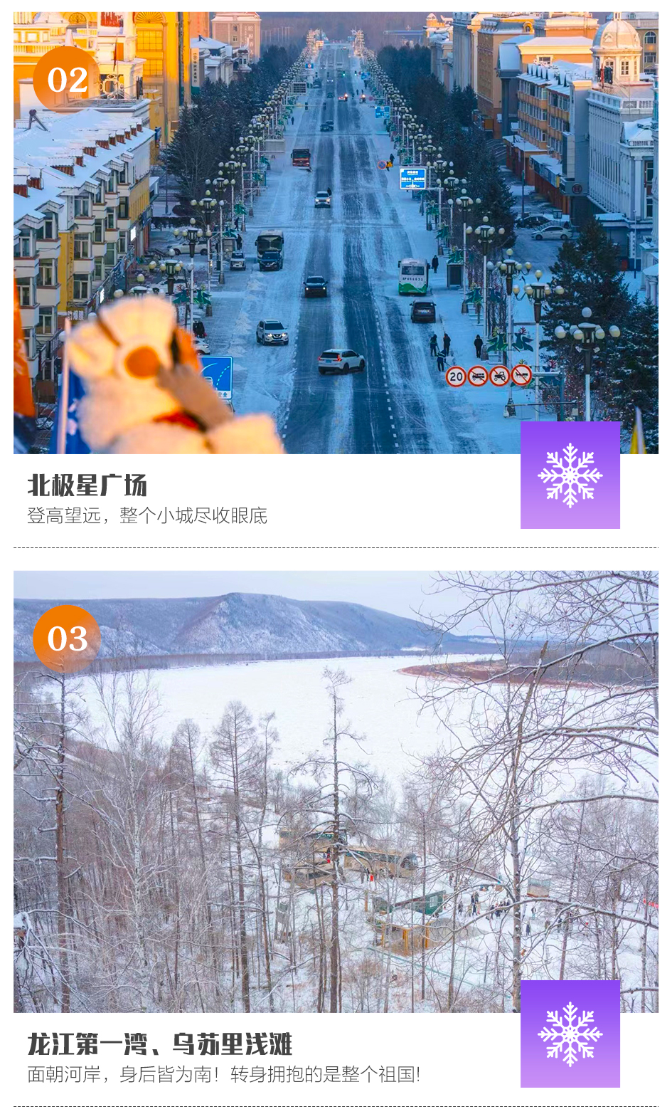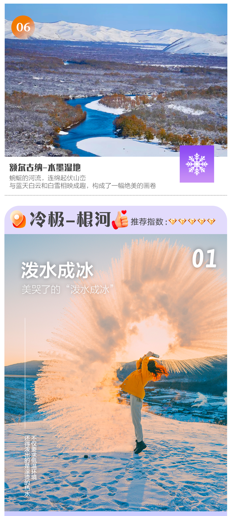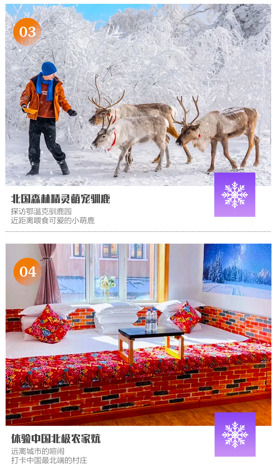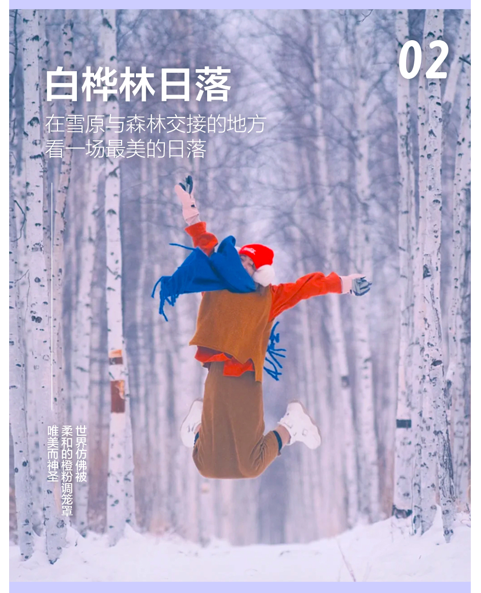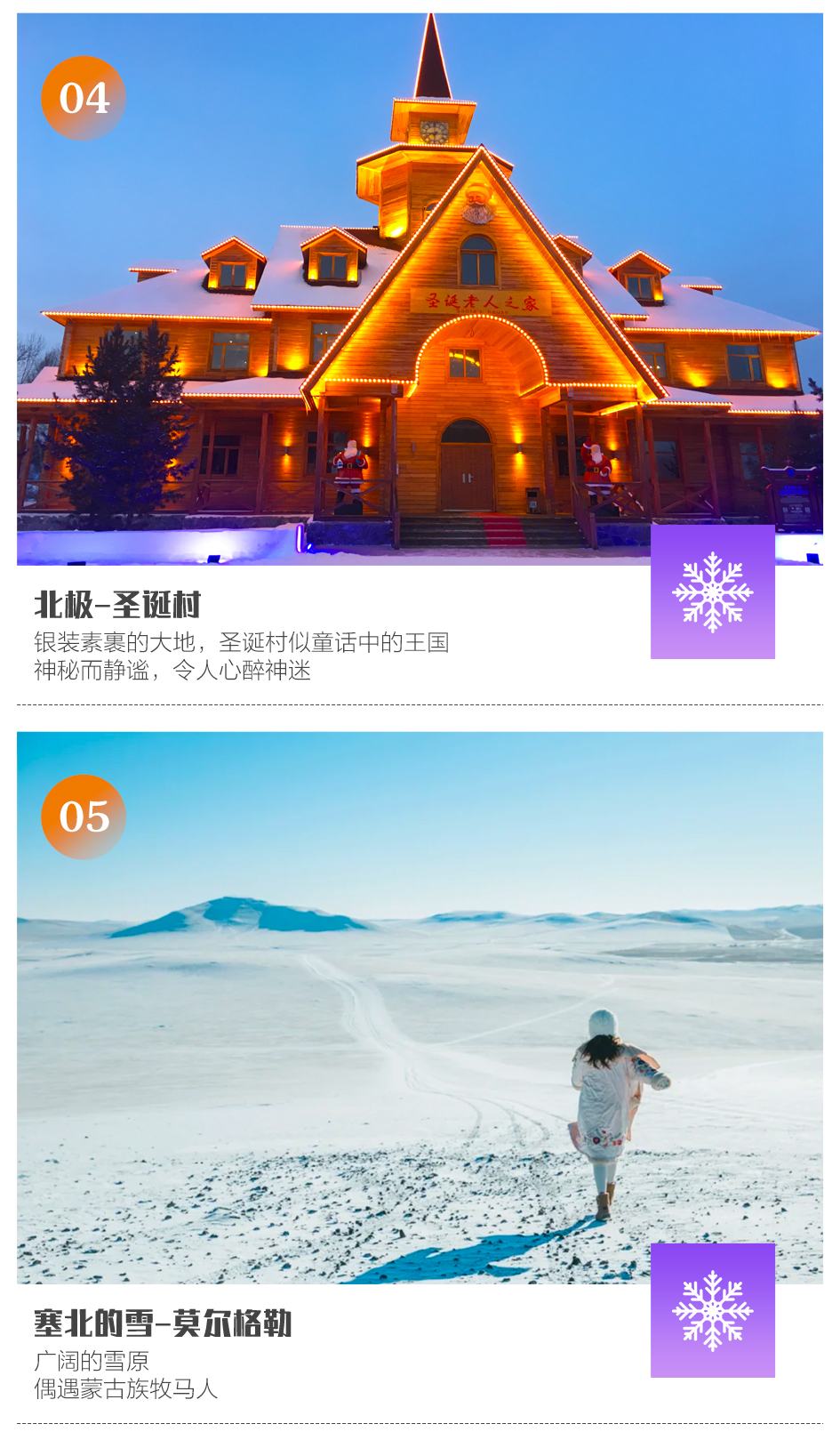 首先前往莫尔格勒河欣赏塞北的雪,牧马的蒙古族,运气好还会参加景区举办的天天那达慕活动,之后前往额尔古纳市欣赏独属于冬日的湿地水墨画,尽情施展你的创作吧,下午前往冷极城市根河,途中欣赏绝美的白桦林偶遇一场雪原绝美的日落,最后入住在根河市区的酒店,晚上来个铁锅炖大鹅,喝一杯东北的小烧,这样的生活何等狭义
