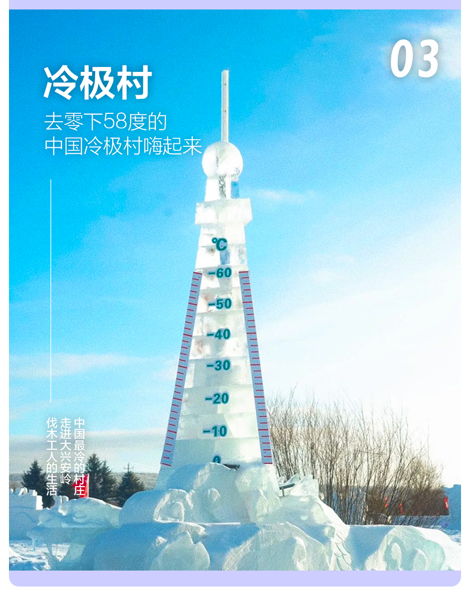 早餐后乘车沿大兴安岭山脉,途经中国最低温度‘零下58度’的测绘点冷极驿站,前往中国冷极村打卡,大家一定要记得穿暖些,冷极村的温度可不是浪得虚名的。