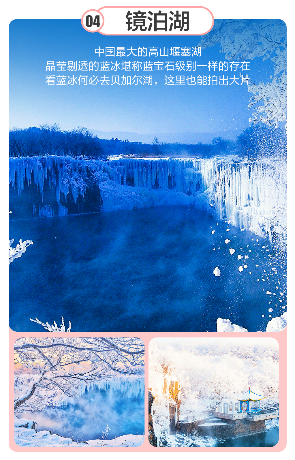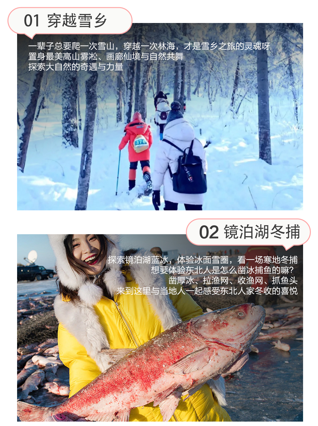3、镜泊湖十一月下旬开始结冰,12月下旬冰冻达到70厘米的厚度,人、车才可在冰面上活动(镜泊湖冬捕每年元月初至次年2月赠送观看,如遇下雪、路况等特殊情况无法观看冬捕,赠送项目费用不退)