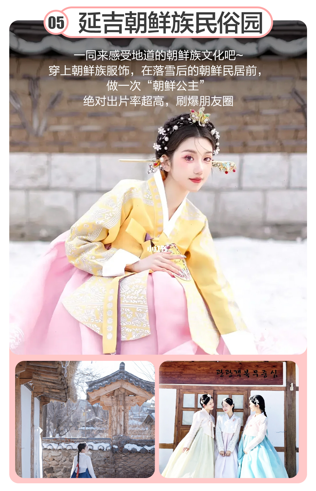 07:30早餐后前往【中国朝鲜民俗园】这里是来延吉一定不能错过的拍照宝地,由40栋朝鲜族民族风格的建筑群组成,我们在这里可以深切的体会到朝鲜族同胞衣食住行的特点,展现了石匠、渔夫、农夫、陶艺、富有等不同家庭的生活场景。无处不在的朝鲜族风情,随手一拍都有韩剧女主角Style。这里有很多影楼,您可根据自己偏爱的风格自主选择旅拍,做一次在逃朝鲜公主。怎么拍都好看!