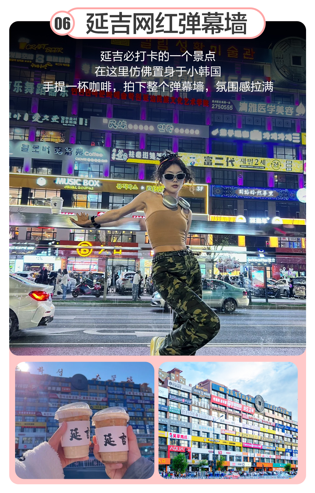 18:00 打卡【延边大学+网红弹幕墙】这⾥不仅⽂化⽓息厚重,就连建筑也具有独特的⺠族⽓息,五花⼋门的牌匾 Logo 宛如“⼤型弹幕墙”,晚上灯光亮起霓虹闪耀着五颜六色的朝鲜族文字,宛如来到了韩国首尔。可以买 ⼀杯上⾯标有“延吉”两个字的后浪咖啡,以⽹红墙为背景拍照打卡留影。