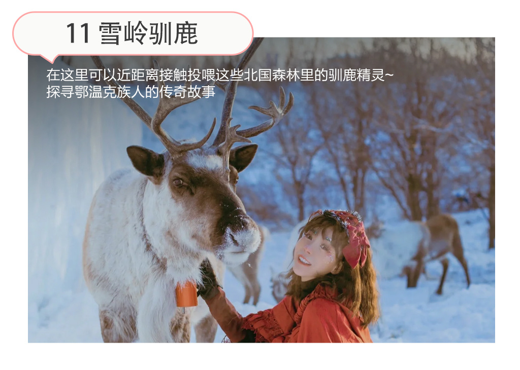 10:30我们驱车前往【雪岭】这里原名叫老岭,冬季雪量大、雪期长、冰雪雾凇资源丰富因此又叫雪岭,每到冬季,这里就变成冰雪童话世界,天气晴朗时,可远眺望延绵起伏的长白山林海和巍峨耸立的长白山主峰,来到这里你可以领略独特的雪松、雪韵。每当遇到降雪时便会形成漫山遍野玉树琼花,美景尽收眼底。走进【驯鹿园】,可以近距离接触一群可爱的冰雪精灵——驯鹿