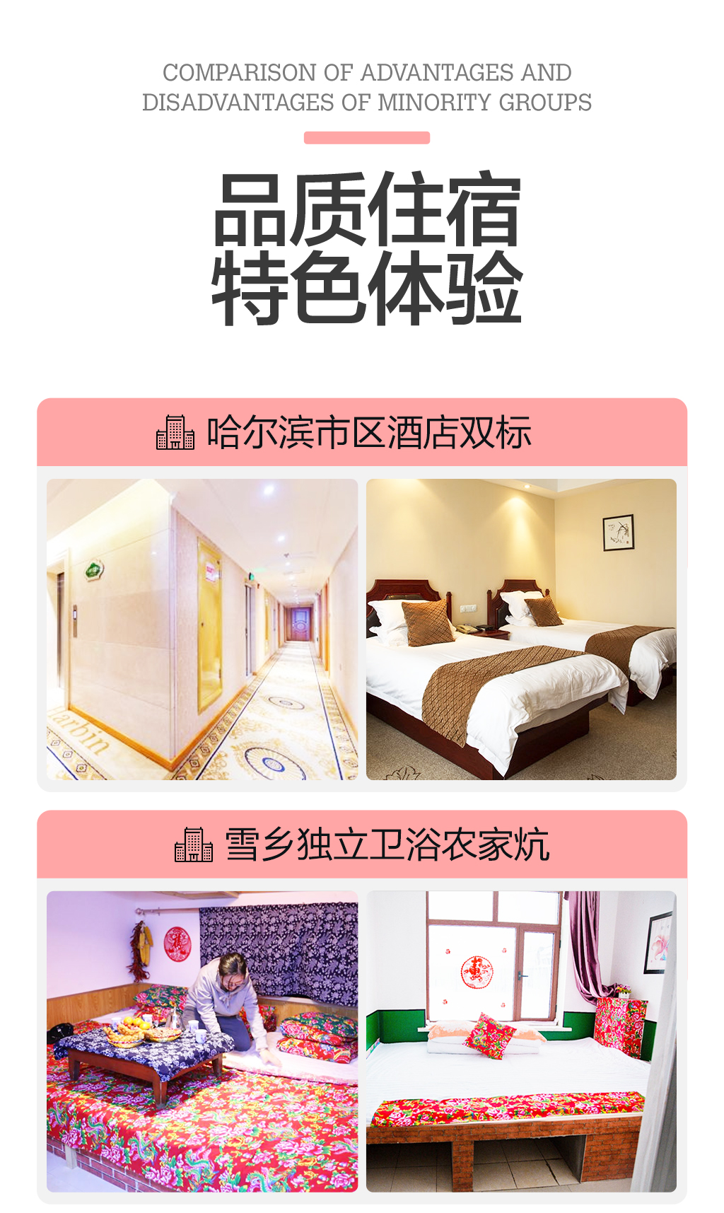 行程中出现单男或单女不想拼房须补全程四晚单房差,优惠期700元/人,正价期1000元/人,圣诞、元旦期1200元/人,春节期1400元/人(单房差为5晚酒店单住,雪乡农家炕单住请现询客服额外补差价)