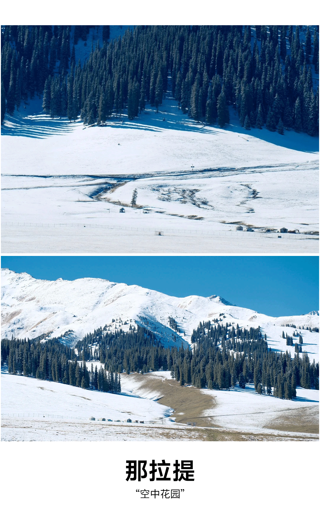 早起后前往那拉提,冬日的那拉提皑皑雪山巍峨耸立,像是忠诚的卫士,静静守护着这片草原。雪岭云杉挺拔而庄严,一排排一列列投下斑驳的光影,哈萨克的绽放如落在海上的白帆。