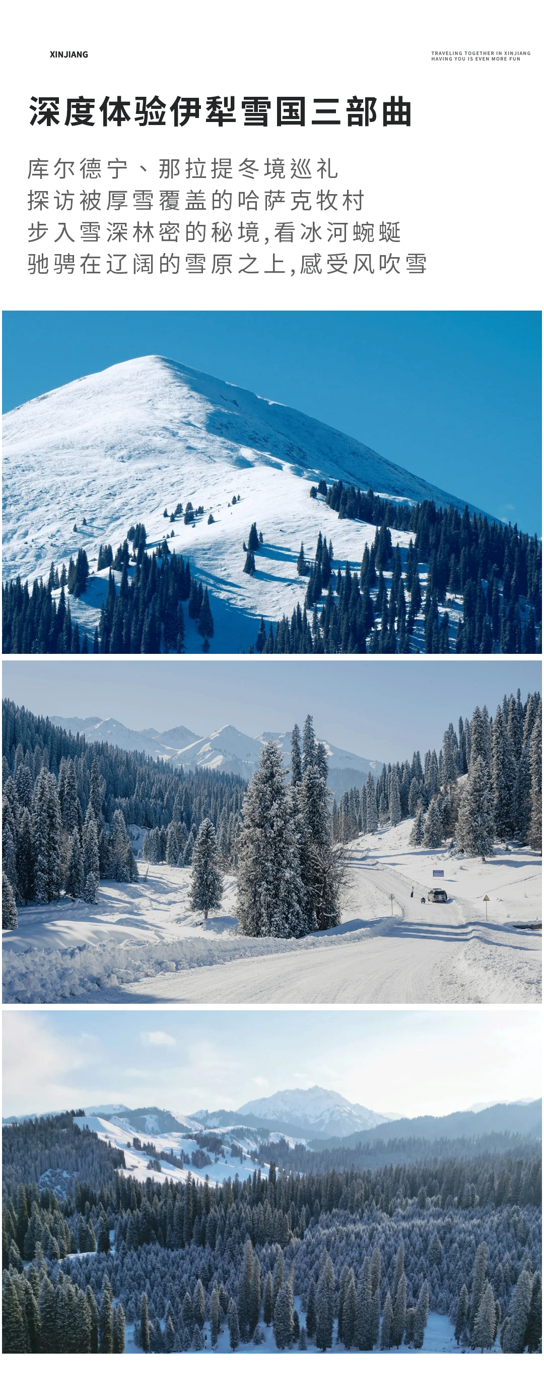 早晨在美景中苏醒,开始正式游览库尔德宁。冬季的库尔德宁,皑皑白雪将这里妆点成一个超凡脱俗的琉璃世界,每一寸景致都透着空灵与静谧,宛如遗落人间的仙境。举目四望,连绵起伏的山峦像是被大自然披上了一层洁白无瑕的绒毯,天山雪岭云杉也换上了银装。脚下,厚软的积雪发出“咯吱咯吱”的轻响,像是在轻声诉说着冬日的秘密。每一步踩下去,都能感受到雪的细腻与温柔。四周的草地早已被雪深深掩埋,平日里星星点点的野花踪迹全无,唯有白茫茫一片,纯净得让人不忍心去破坏这份美好。不远处,蜿蜒的溪流也被冰雪封印,冰面光滑如镜,倒映着岸边银装素裹的世界,像是一面通往童话国度的魔镜。偶尔有几处未完全冰封的地方,溪水在冰层下潺潺流动,发出微弱却又执着的声响,给这寂静的雪境添了几分灵动。抬眼看向远方,云雾与白雪交织在一起,模糊了山峦与天空的边界,一切都变得如梦似幻。“