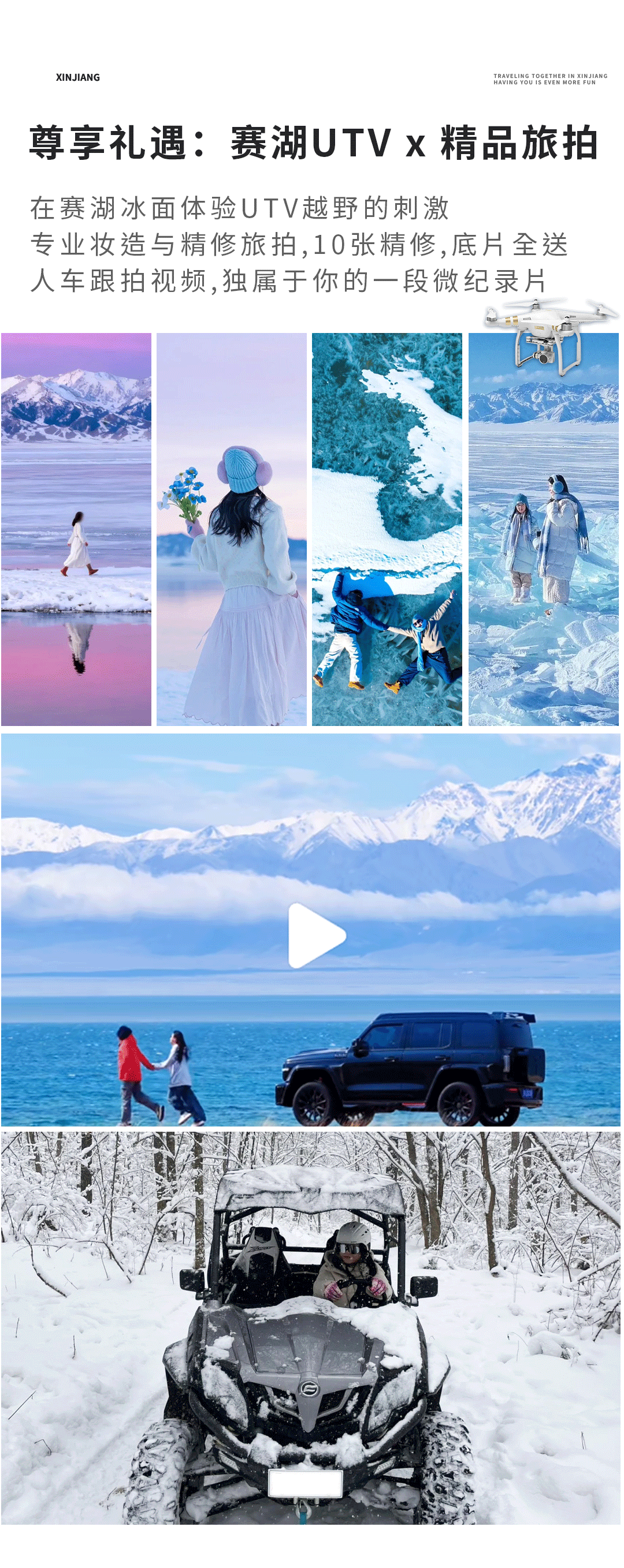 3、赛湖UTV乘坐体验+精品旅拍(1套妆造+10张精修+底片全送+航拍人车跟拍)