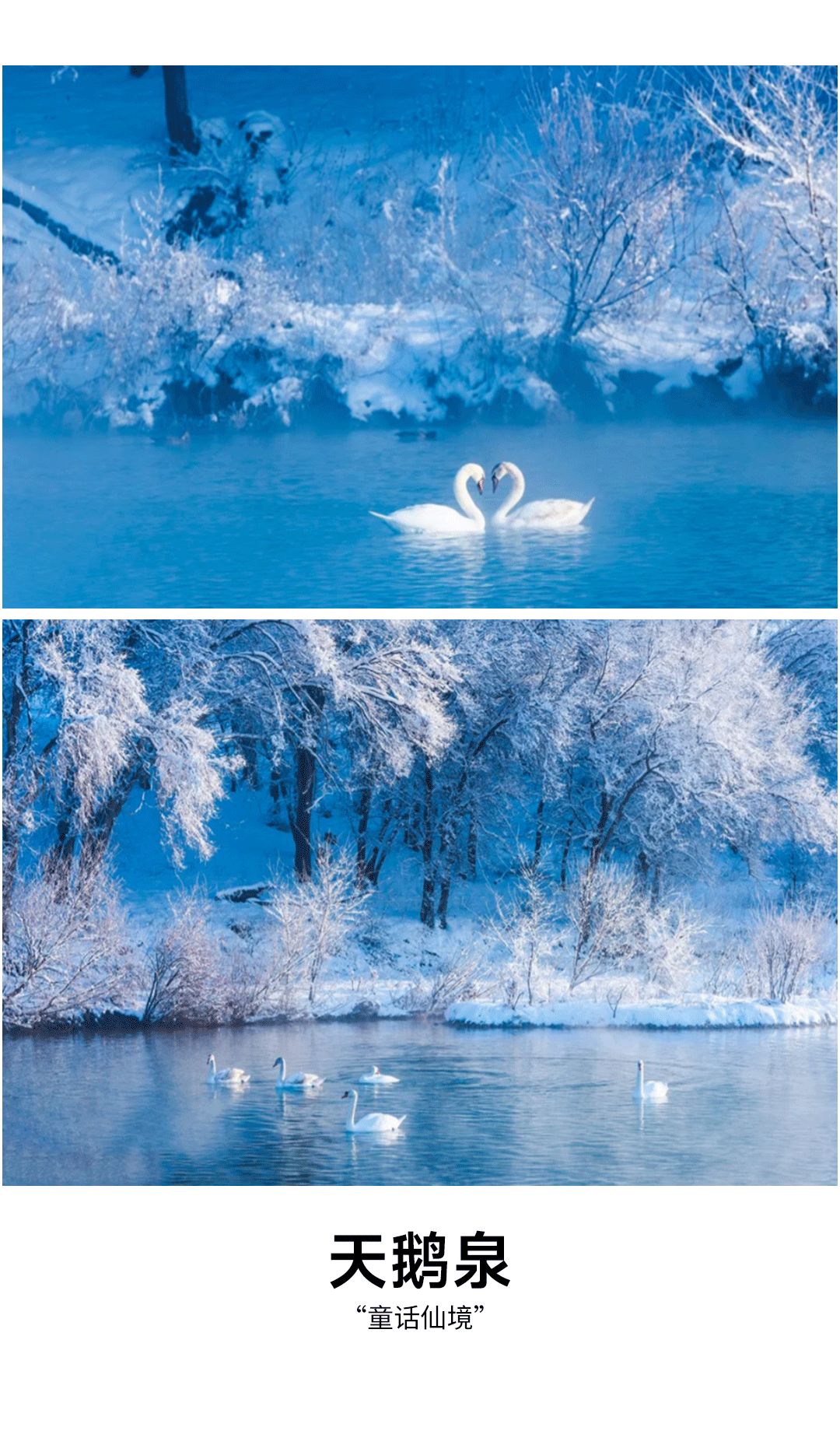 1.雾凇为自然现象,并非每日都有。即使没有雾凇,当地的温差也会使晨光中的天鹅泉出现云雾缭绕,仙气飘飘梦幻般的人间仙境。
