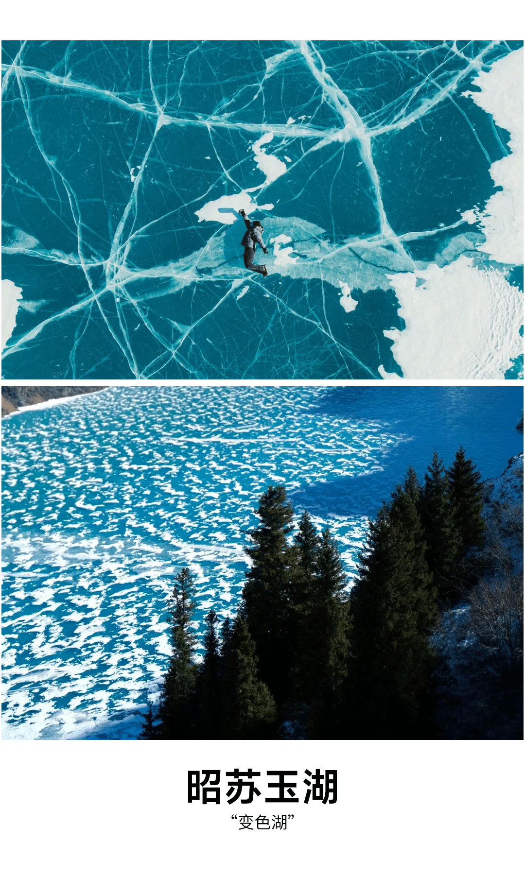 早起后前往游览赛里木湖,首先我们可以前往体验冰雪UTV,一起飞驰于蓝冰之上,感受冰雪中越野的狂野刺激。随后开始环湖,冬天,湖泊底部茂盛的水草产生的气泡,为冰泡景观的产生提供了基础。赛里木湖冬季十分寒冷,冰封期有时可以达到5个月之久,气温骤降之时,冰雪一夜就能覆盖湖面,冰泡层层叠叠,十分壮观。冰泡被封冻在湖面之下,阳光灿烂时,蓝色的湖泊好似一块掉落人间的蓝宝石。再加上四周环绕的群山,更是与蓝色的冰湖、白色的冰泡辉映,组成了一幅美丽的画面。此外,与新疆的其他湖泊相比,赛里木湖不仅海拔高,而且风特别大,有时可以达到8—9级。呼啸的狂风,能将堆积在湖面上的积雪快速地清理干净,并且还能将湖面打磨得更光滑,提高冰层的透明度,为冰泡的展示提供“舞台”。