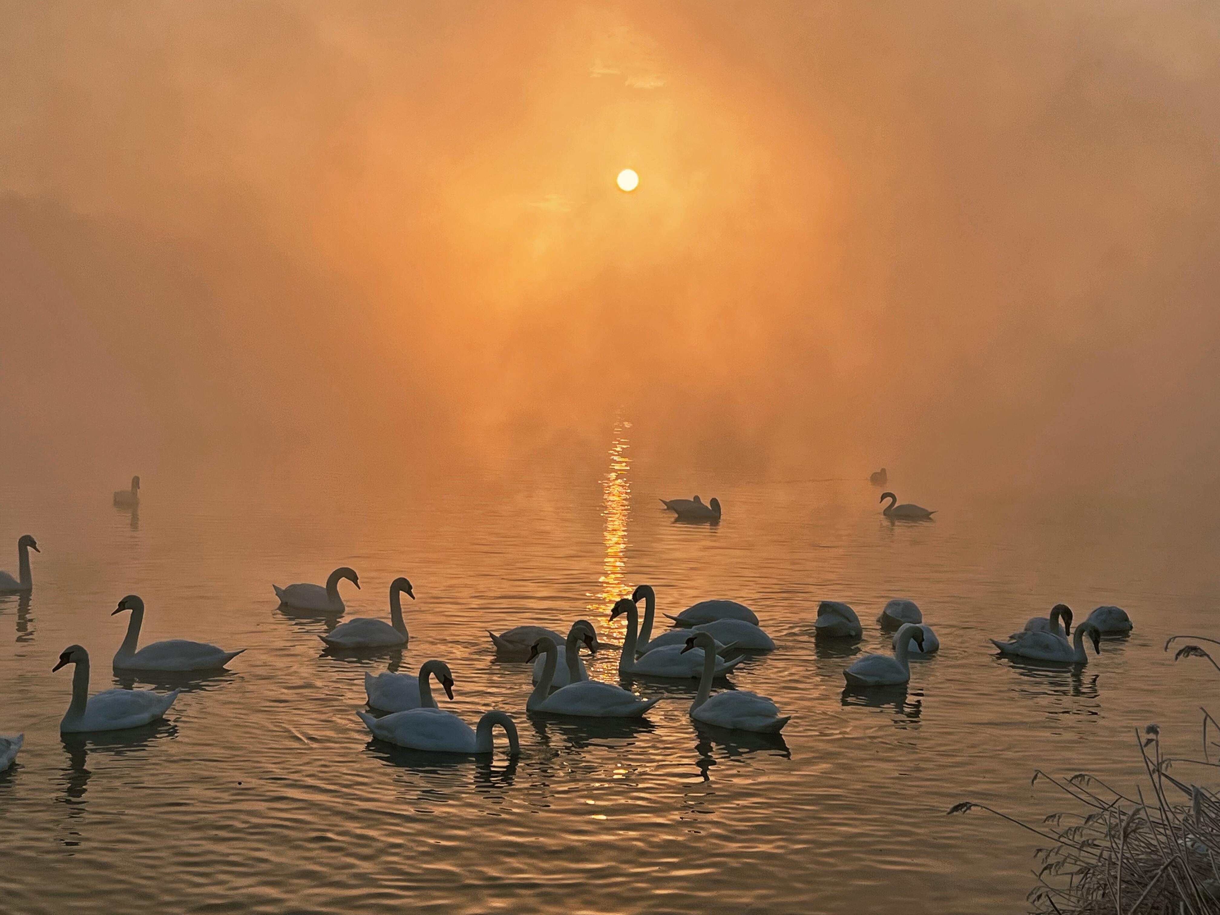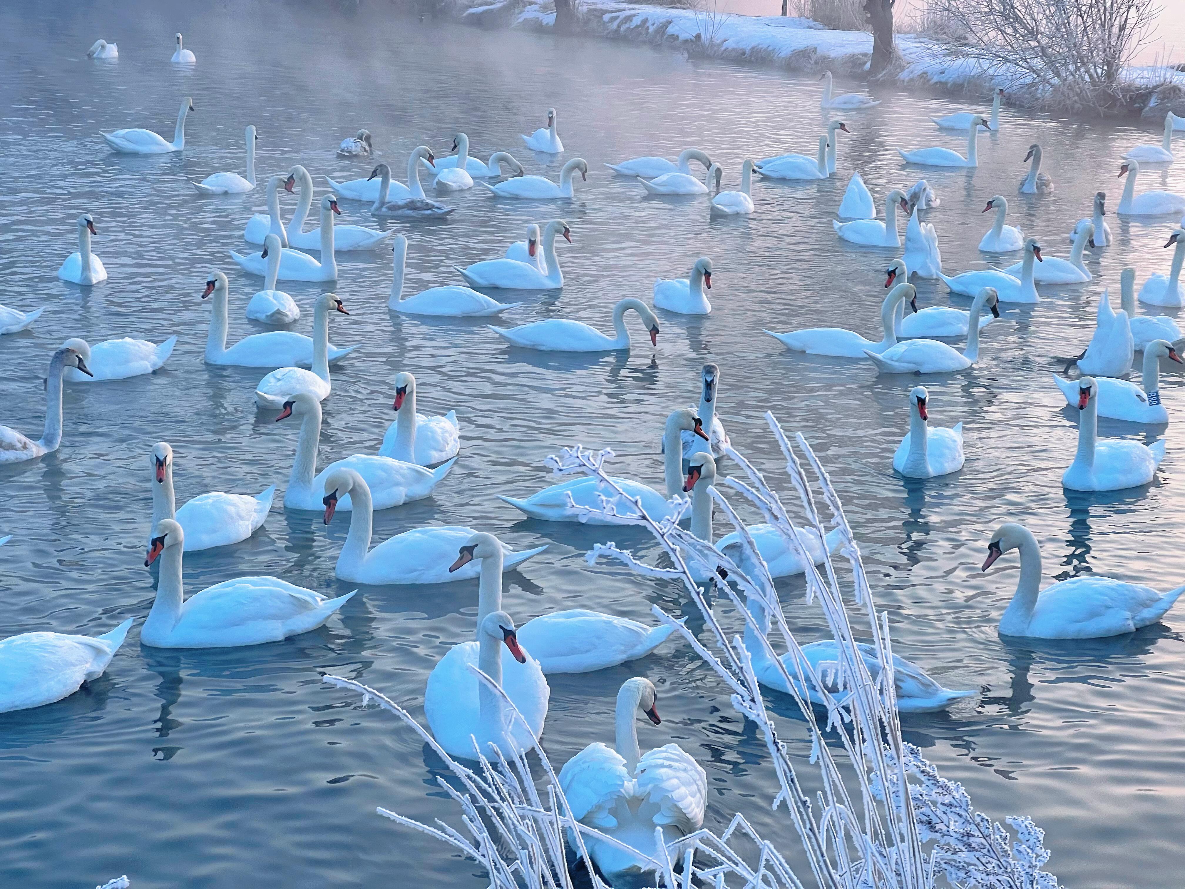 随后前往天鹅泉湿地公园,这里是现实版的“冰雪童话”!抵达这里,湖面飘着薄雾,天鹅在芦苇丛中游荡,绕着木栈道散步,两旁的柳树挂满冰晶,阳光洒下来,像给这里洒满了碎钻,风吹时还有“雪沫”飘落,走到湖心亭,能同时拍摄到雾凇,湖水,天鹅的超治愈画面。