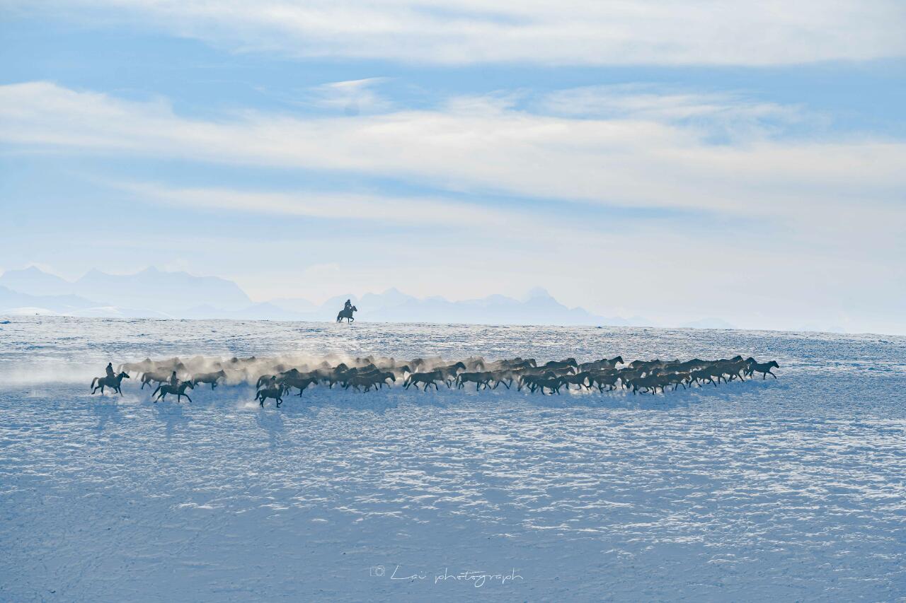 下午我们前往天马文化园,近200匹骏马在雪地上扬鬃奋蹄,腾起雪雾驰骋而来,广袤的草原被厚厚的积雪覆盖。在白茫茫的雪原上,奔腾的马群鬃毛披银挂霜,嘶啸声由远及近,踏起千重雪浪……在新疆昭苏县的广阔雪域草原上,飞奔的骏马踏出了壮观的“天马踏雪”视觉盛宴。