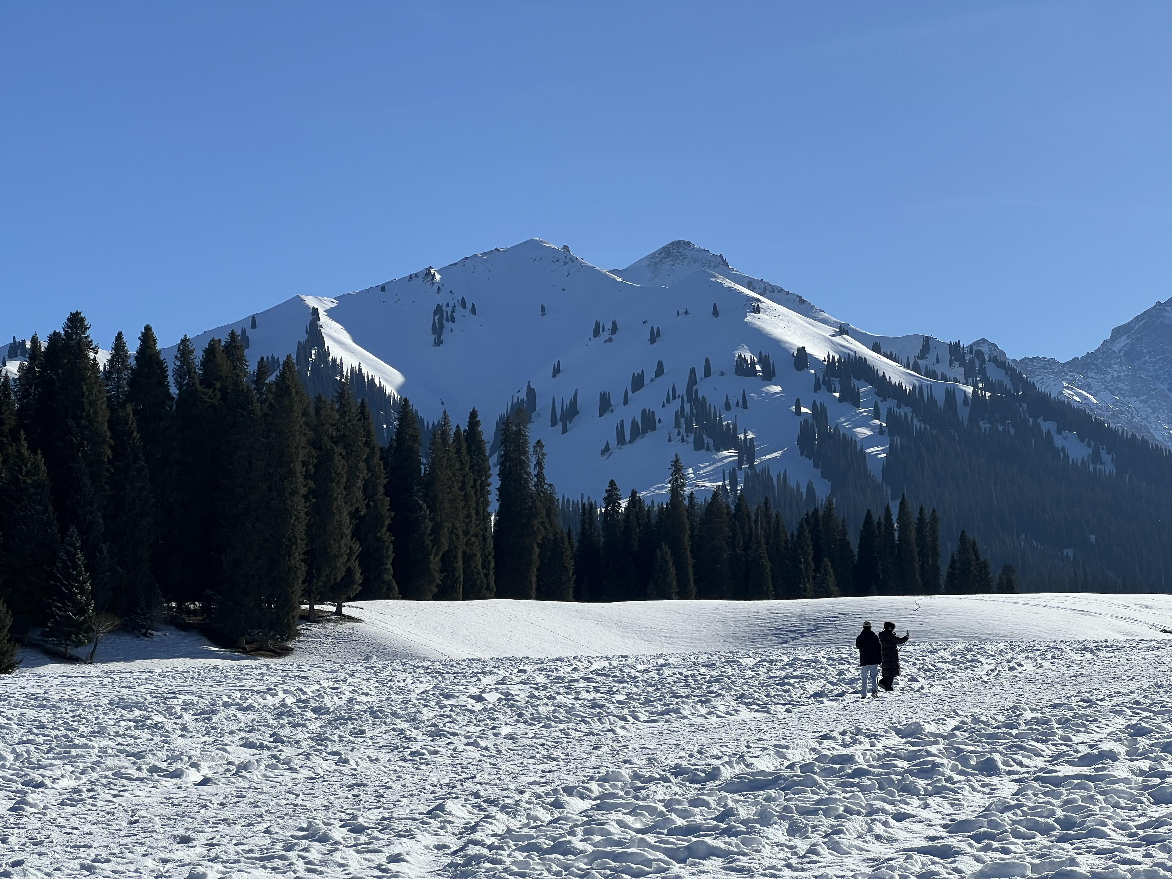 早起后正式游览那拉提,冬日的那拉提皑皑雪山巍峨耸立,像是忠诚的卫士,静静守护着这片草原。雪岭云杉挺拔而庄严,一排排一列列投下斑驳的光影,哈萨克的绽放如落在海上的白帆。