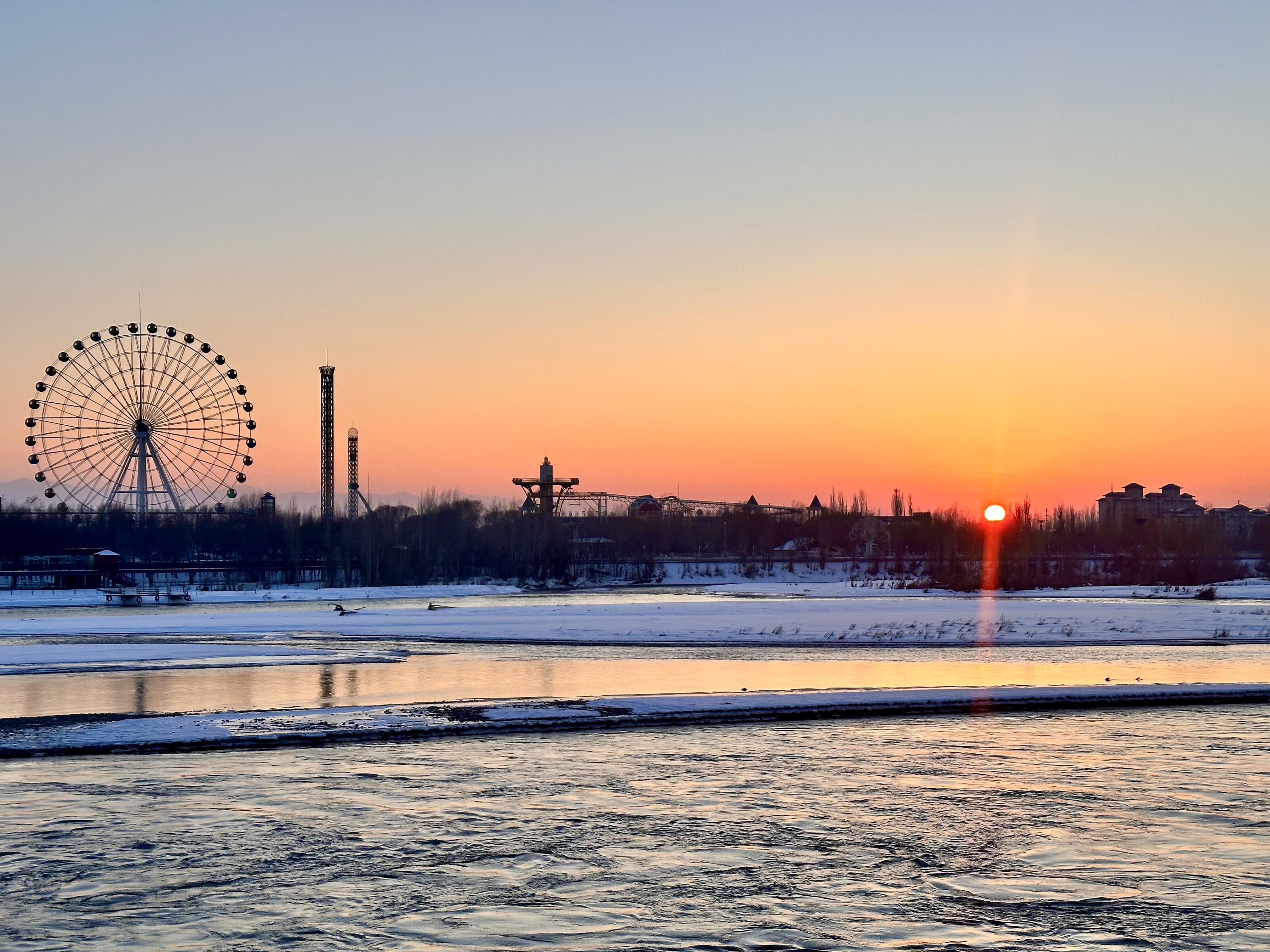 在日落时分时分赶往伊犁河风景区,伊犁河的日落视野开阔,在伊犁河大桥上观看日落,可以看到长河落日的壮丽景色。远方是蜿蜒的河流,冬日结冰后,太阳逐渐西沉,将整个河面染成金黄色,在冰面上金光闪闪。随着太阳下落,光线的范围不断扩大,壮观不已。