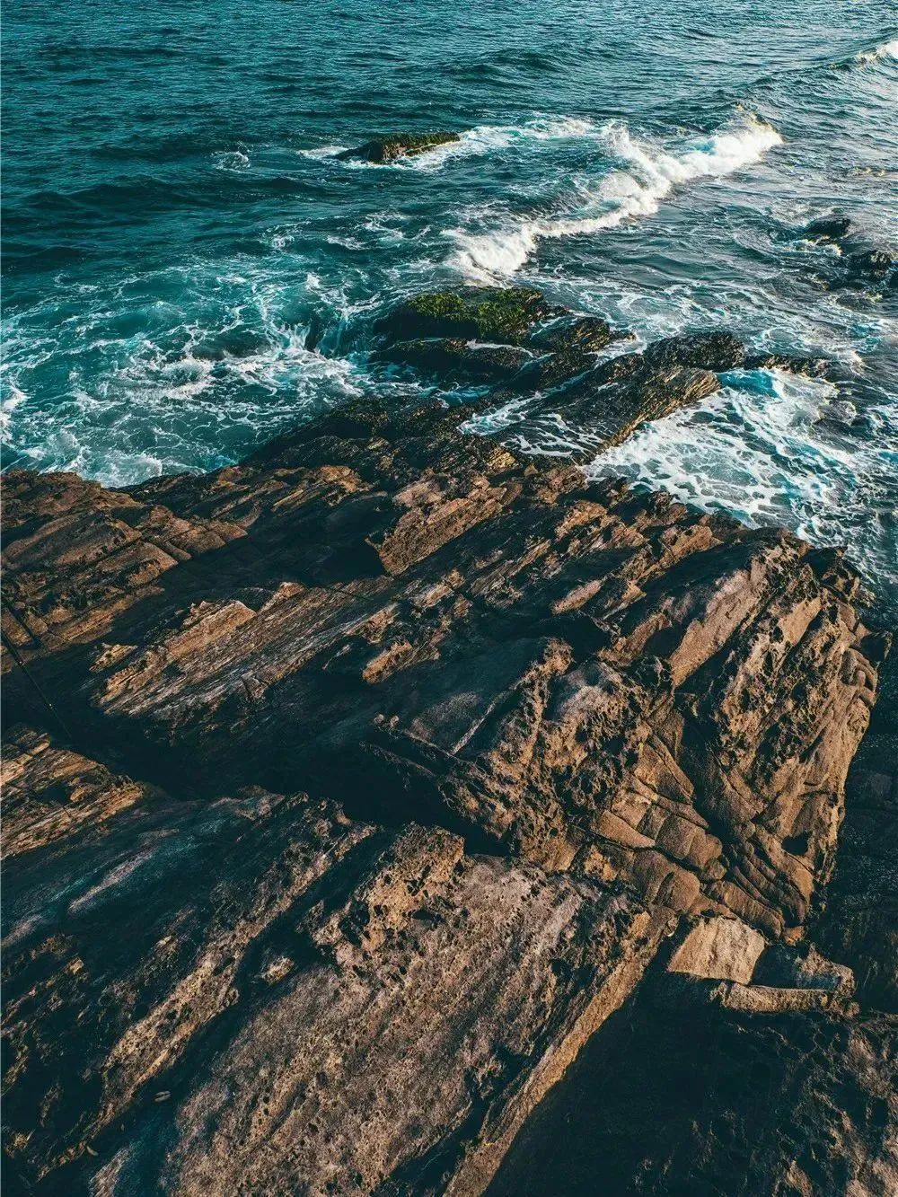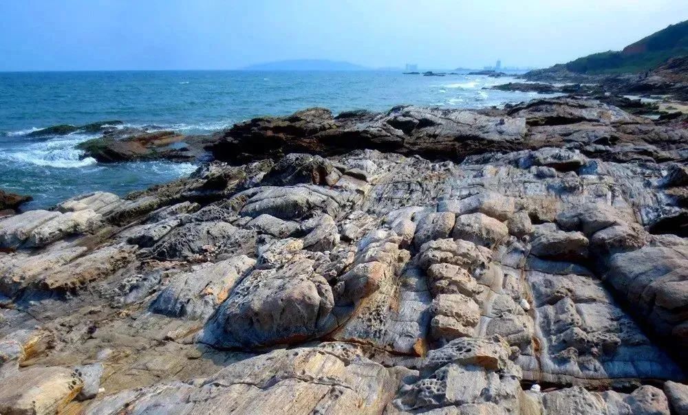 海边礁石林立,层层叠叠的礁石深入海中,仿佛刀刻般的痕迹。走近这些黑礁石,你会发现脚下的石头形状各异,仿佛来到火星表面。