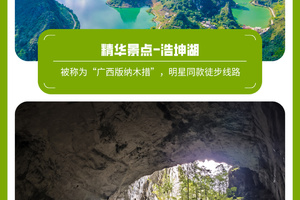 08:00早餐后出发,坐车1小时到达浩坤湖徒步起点,今天徒步网红浩坤湖穿越线,全程约13公里,爬升500米,徒步6小时左右。中午也是路餐干粮。这里也是广西山水经典的徒步景色