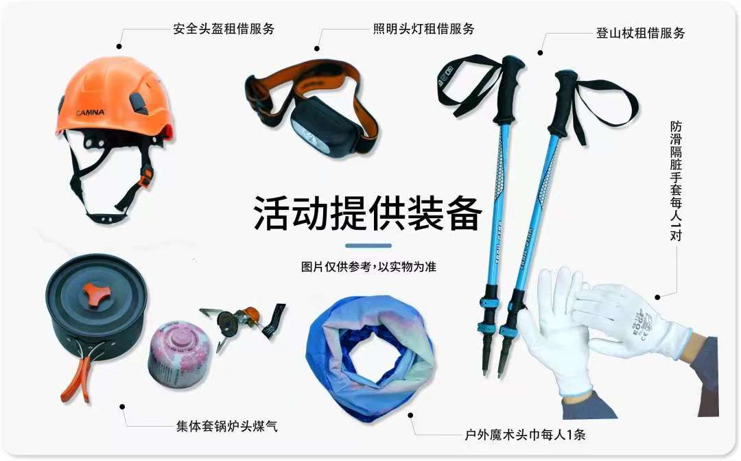 3.活动提供装备中说明的:头盔/登山杖各一件免费租借(用后回收,如需要双杖请提前告知);