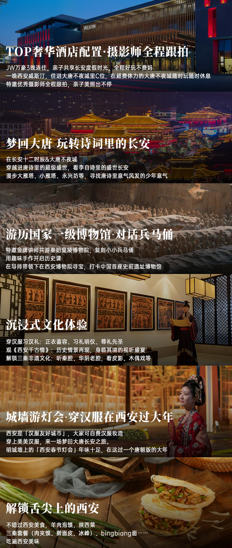 于是有了这条「长安亲子营5日」,对话馆藏国宝+沉浸式非遗手作+穿越式汉服体验+全程国际奢牌住宿……