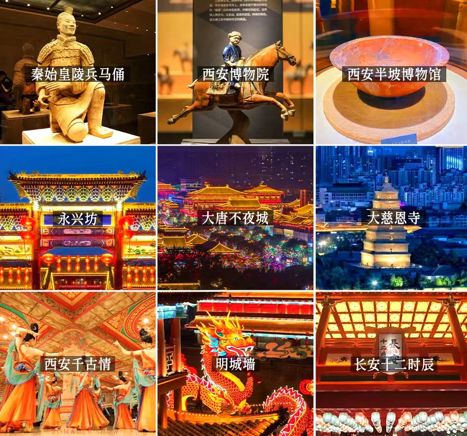 4、门票:秦始皇陵博物馆首道大门票;西安半坡博物馆门票;长安十二时辰大门票;明城墙门票;大慈恩寺门票。