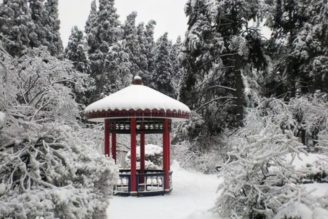 冬季水波潋滟的如琴湖面结成平静清澈的冰湖,