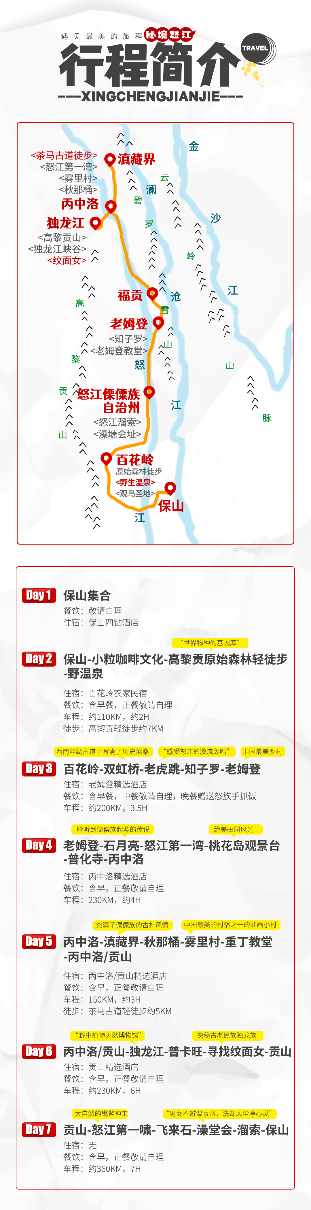 2、全程住宿费6晚(保山四星钻酒店1晚,百花岭民宿1晚,老姆登精选酒店1晚,丙中洛/贡山精选酒店3晚);