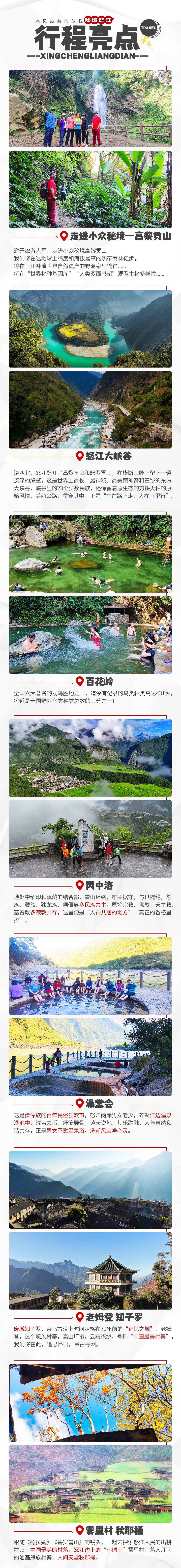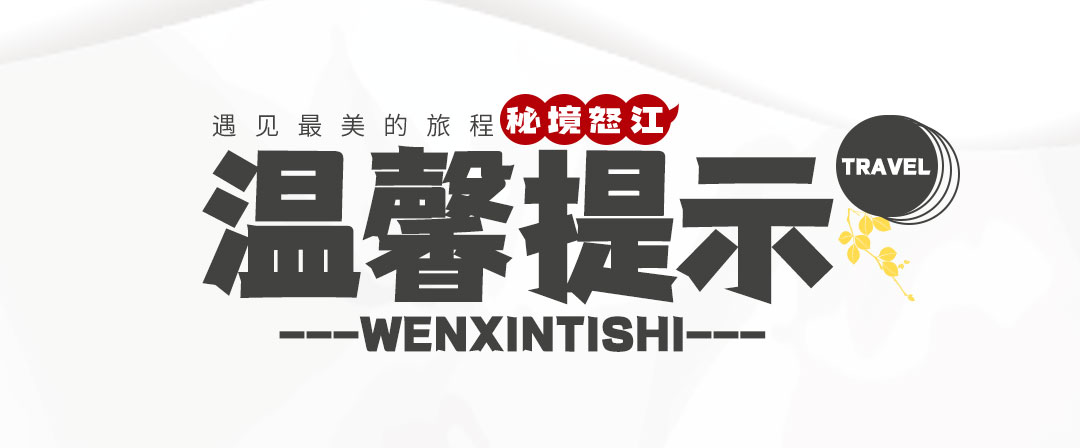 1、独龙江位于祖国边境,山高路远,若因不可抗力(堵车、道路塌方等)或政策因素无法进入,领队将会对行程做适当调整,保证行程的顺利进行;