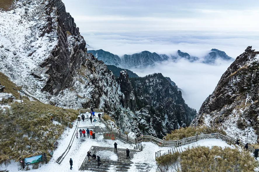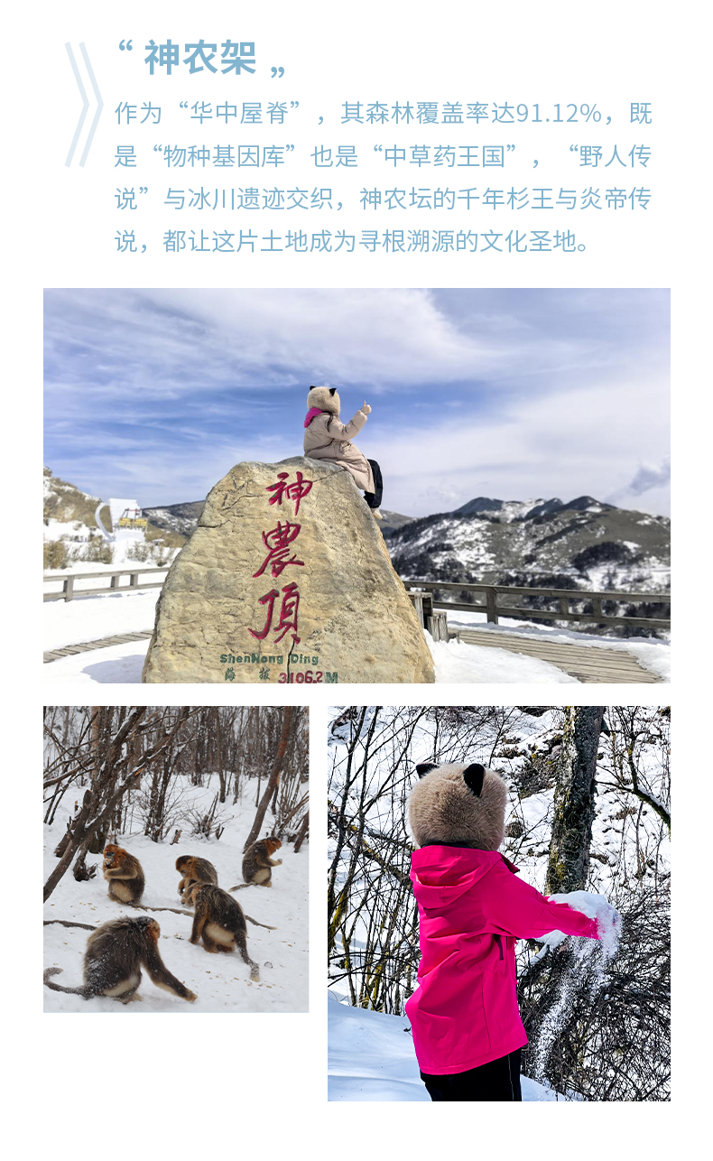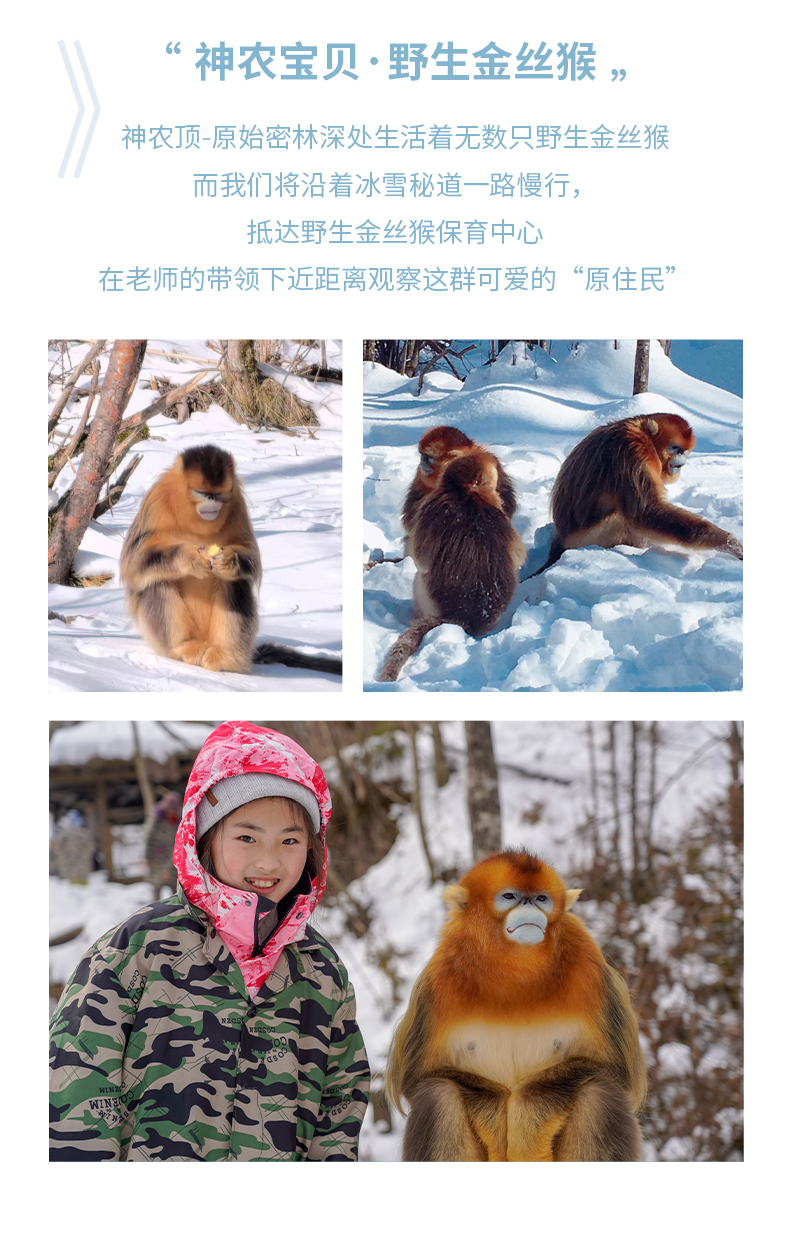 在科研人员的带领下近距离接触这群野生金丝猴,这里可是不对游客开放的哦~随后前往【神农顶】,站上神农架制高点--【华中第一瞭望塔】,俯视神农架林区凌冽而壮阔的雪景。随后,在神农顶开展堆雪人,打雪仗等玩雪活动。飞溅的雪沫里藏着最纯粹的快乐,定格冬日专属的雪白记忆。