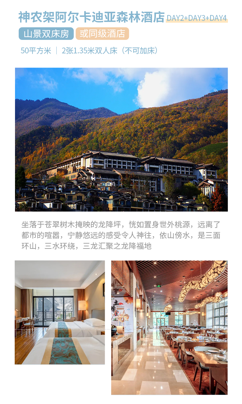 3、神农架地区属于山区气候,冬季天气多变,旅途中车程可能会有变化;金丝猴保育基地】受金丝猴生活习性的影响,科考活动时间安排会根据金丝猴族群的活动路线进行调整,如活动因政策、不可抗力等影响,可能会临时关闭导游会根据现场情况调整行程安排,因此而产生的费用多退少补,敬请理解;