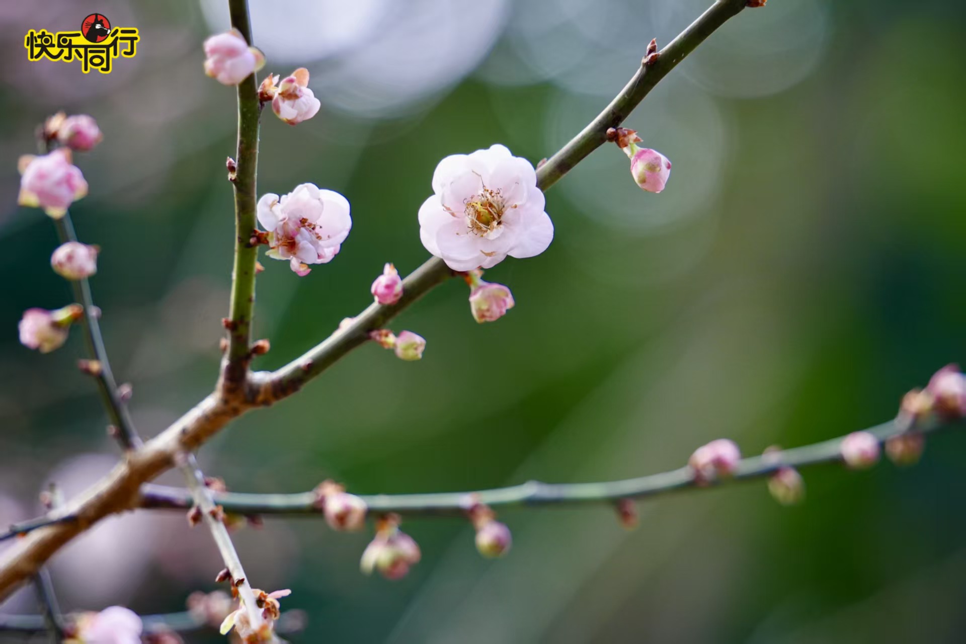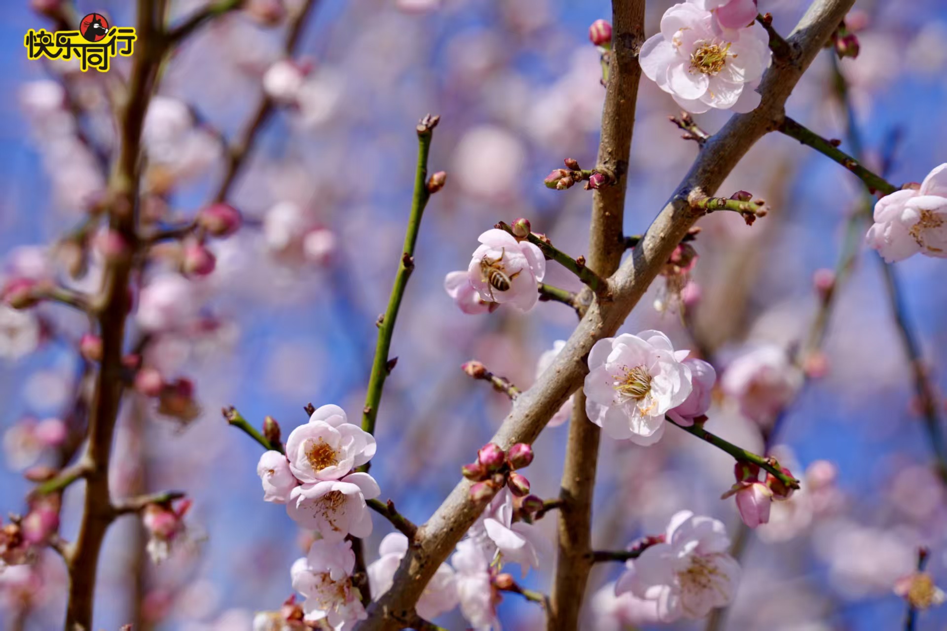 从远处看,梅花似一片雪海,风吹飘香。从近处看,花儿争艳,蜂儿翻飞,如诗如画,非常适合到这里写生、摄影甚至拍婚纱照。