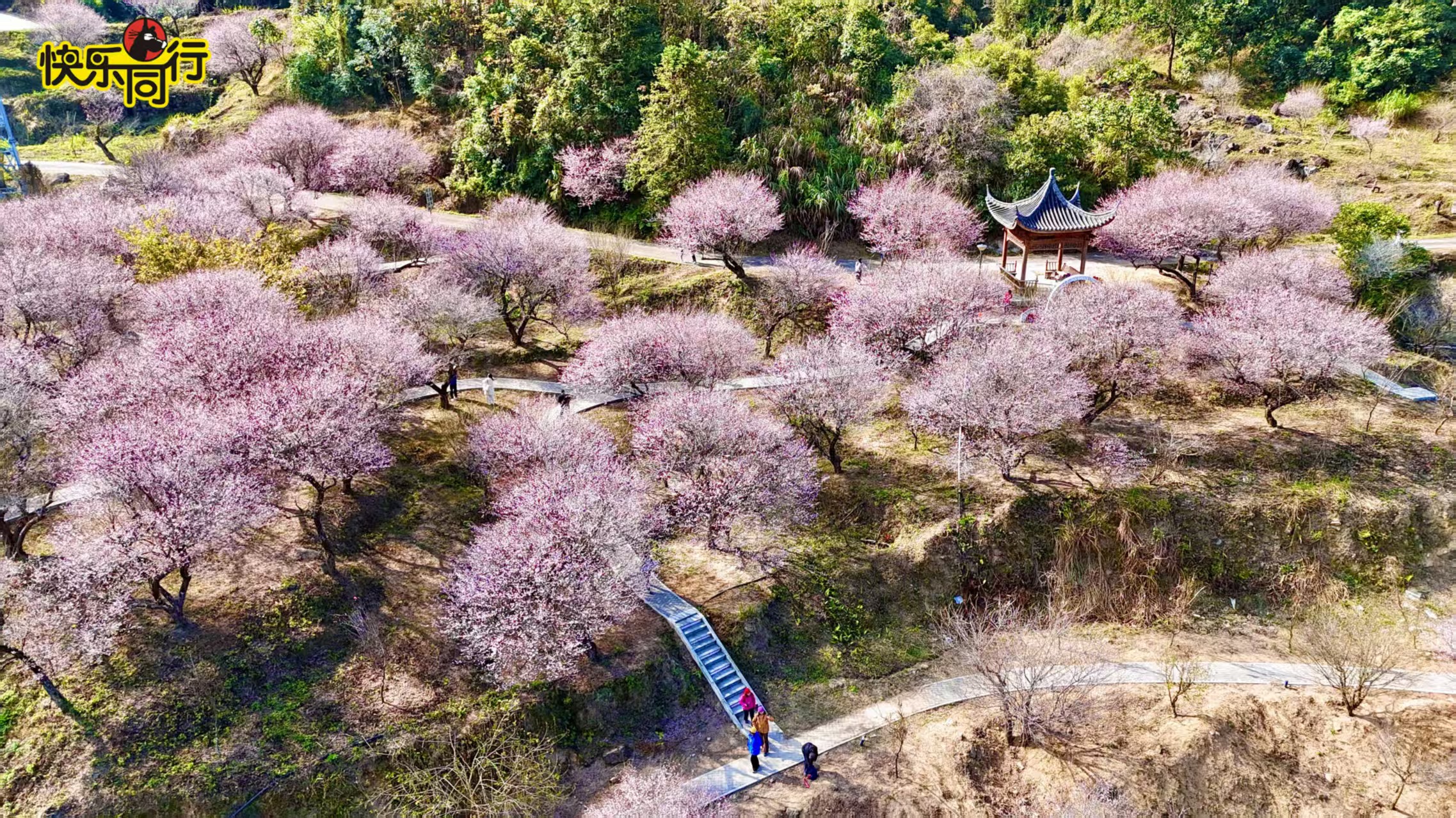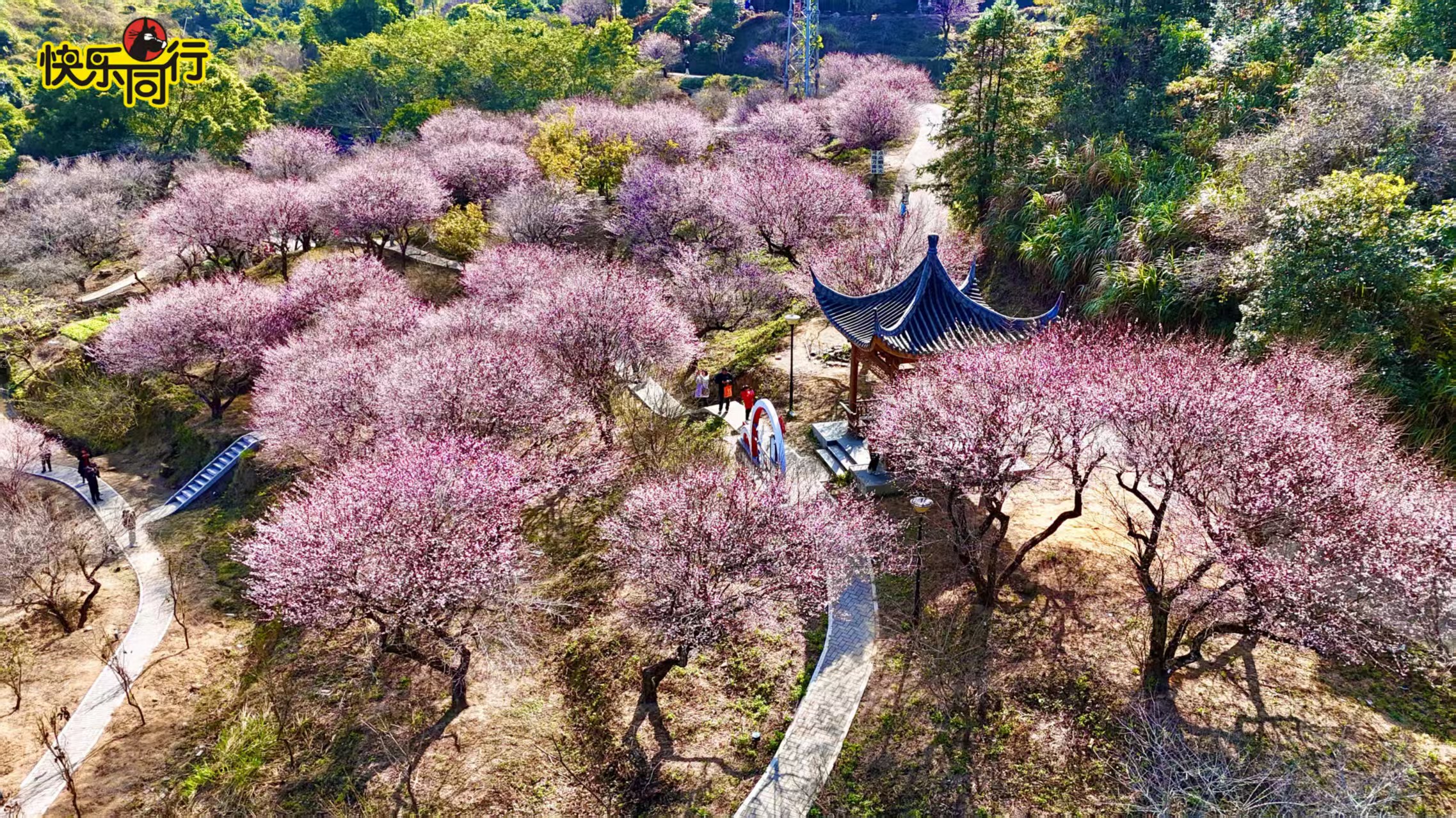 从高空可以看到漫山的粉色梅花,赏心悦目浪漫至极,不是一株,不是一片,而是漫山遍野犹如一片"香雪海",微风吹来,暗香袭人,甚是迷人。